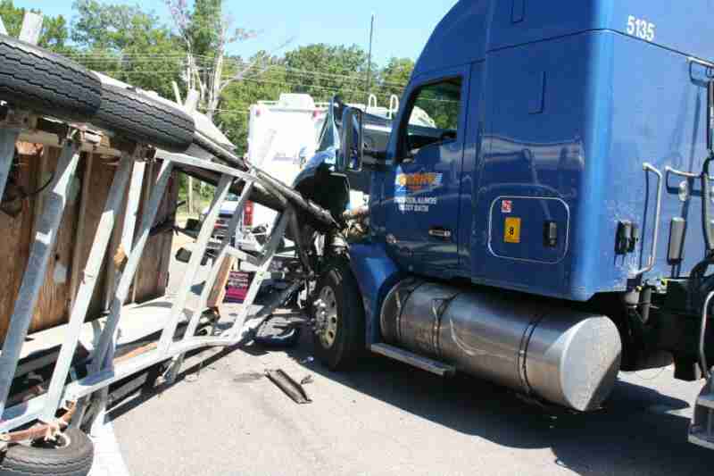 An accident involving an eighteen wheeler and a pickup truck pulling a trailer carrying a pontoon boat took place Wednesday morning on the bypass in Centre.
