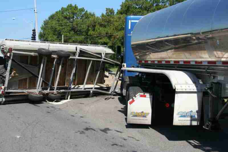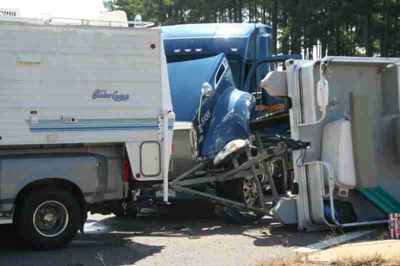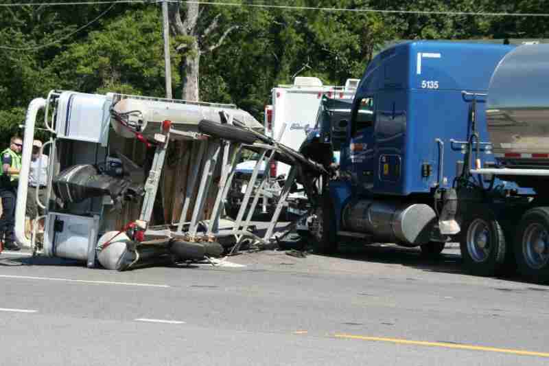 While the pickup was stopped at the stop sign, preparing to turn right, the big rig struck the trailer from behind rolling it over, along with the boat.