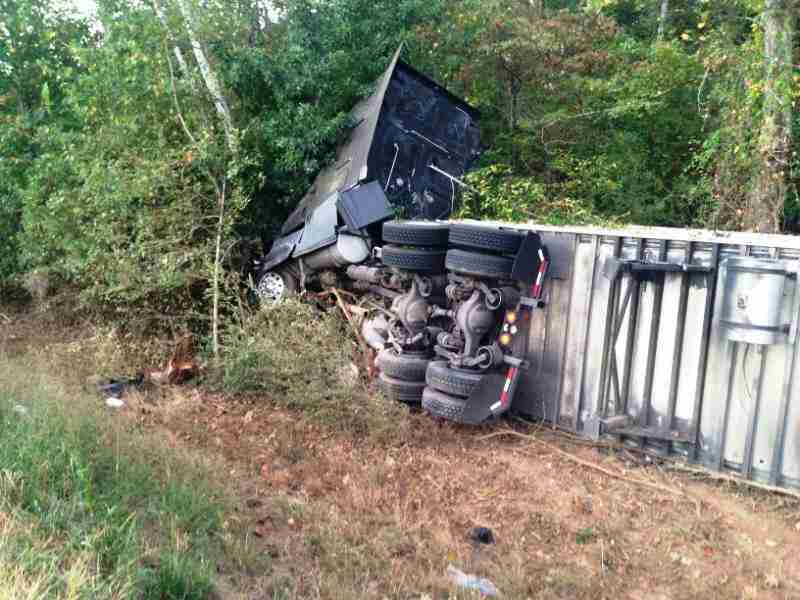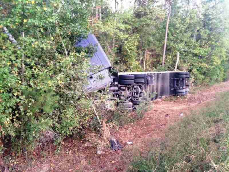 Just prior to 4:30am, Broomtown Fire & Rescue was dispatched to a report of an accident in which an 18 wheeler ran off of the roadway, on the Gaylesville side of Blanche; they arrived to find that the trailer of the Freightliner had rolled over onto its side – lifting the cab off the ground, into tree limbs.