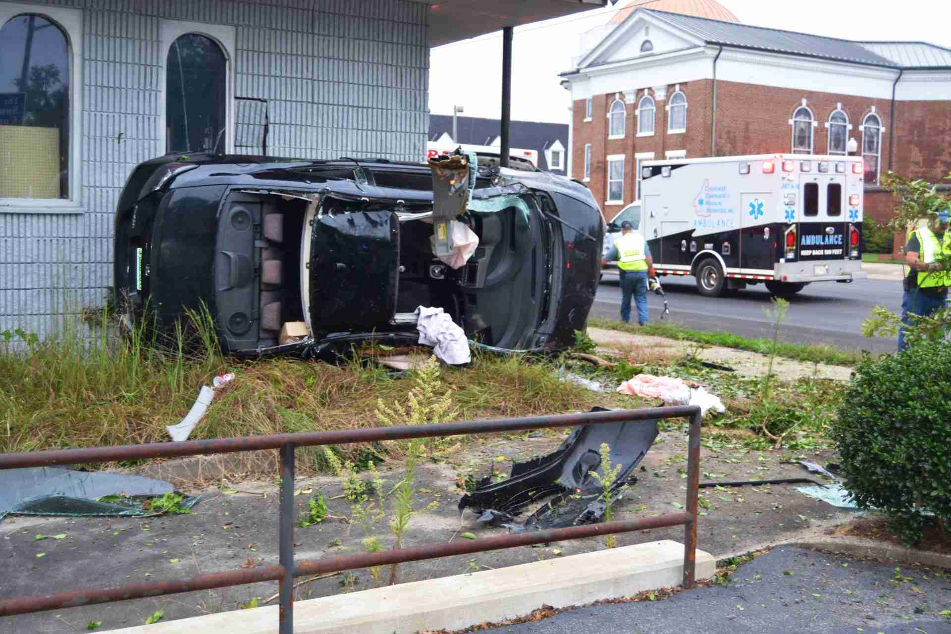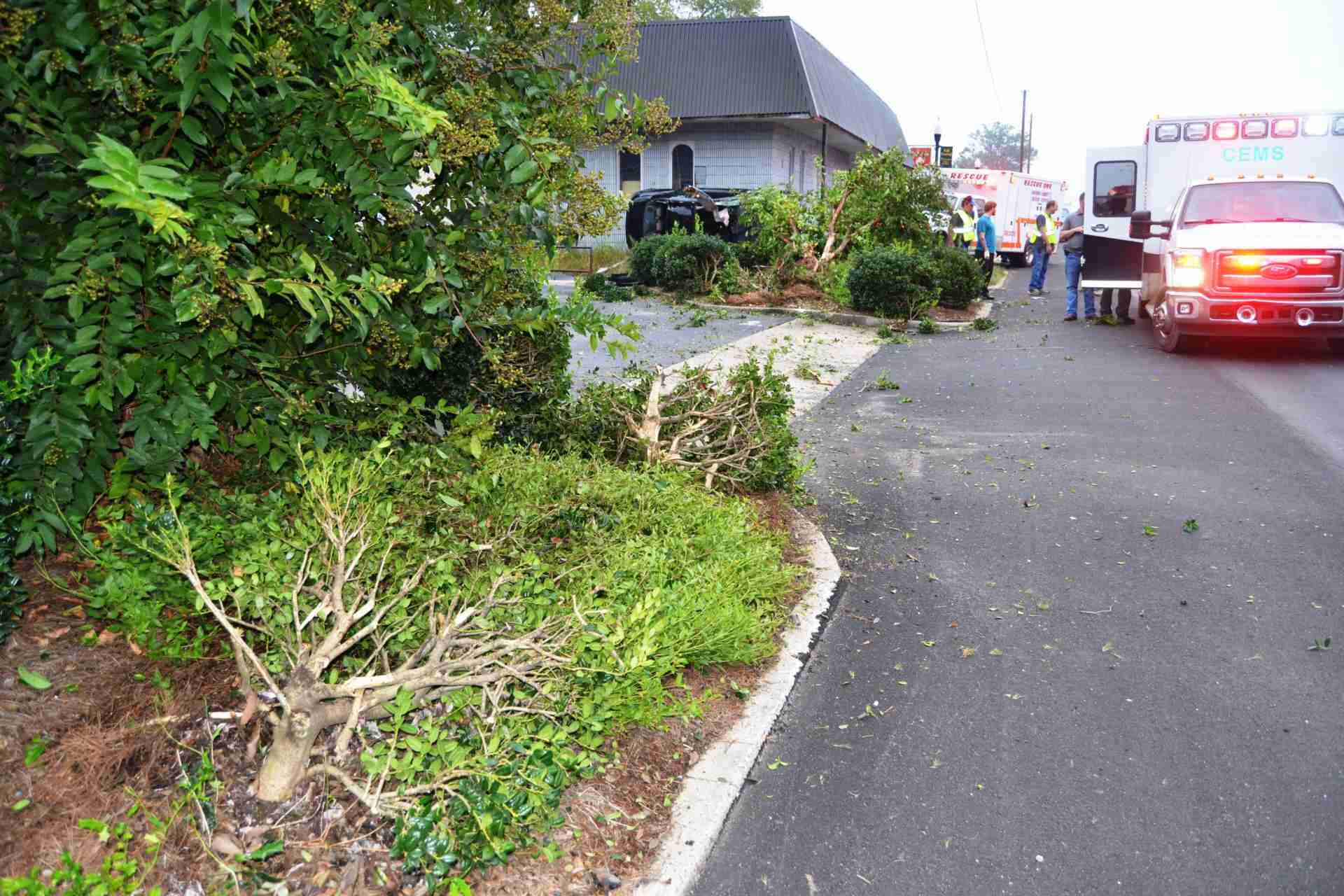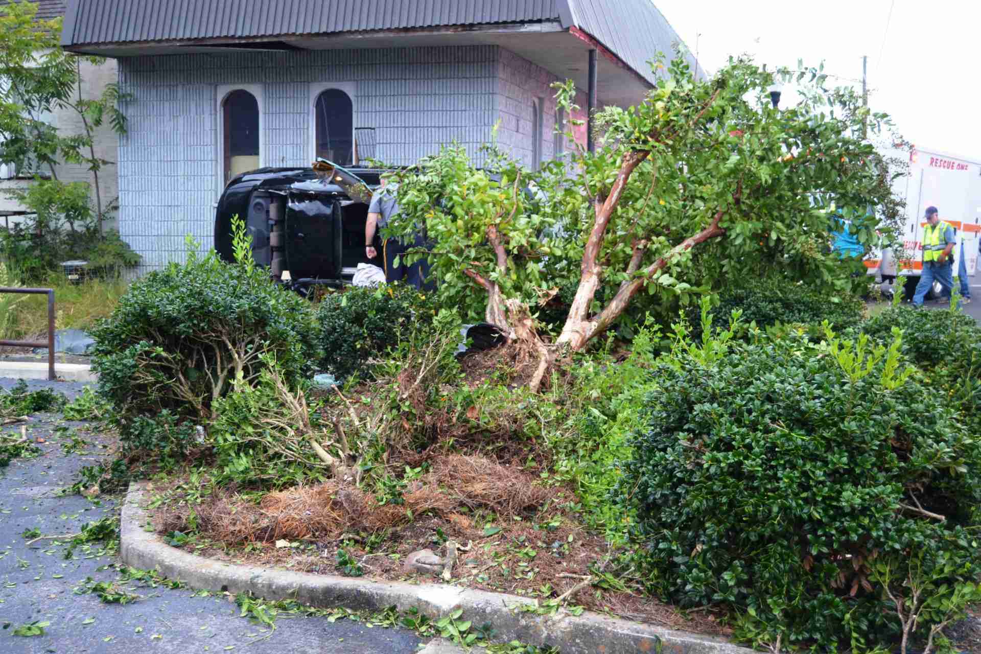 According to witnesses, the vehicle was traveling eastbound, when it crossed over the lanes of traffic, jumped a curb ran through some brush then uprooted a small tree before finally barreling into the building, coming to rest on its side. The male driver had to be extricated from the vehicle by members of the Rescue Squad.