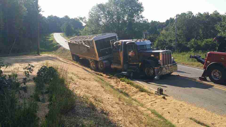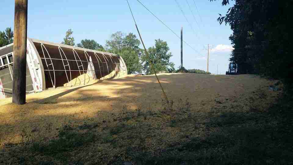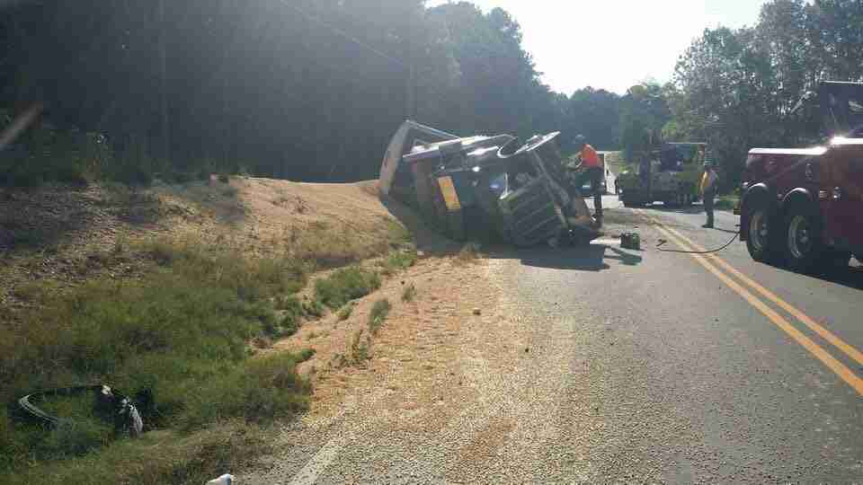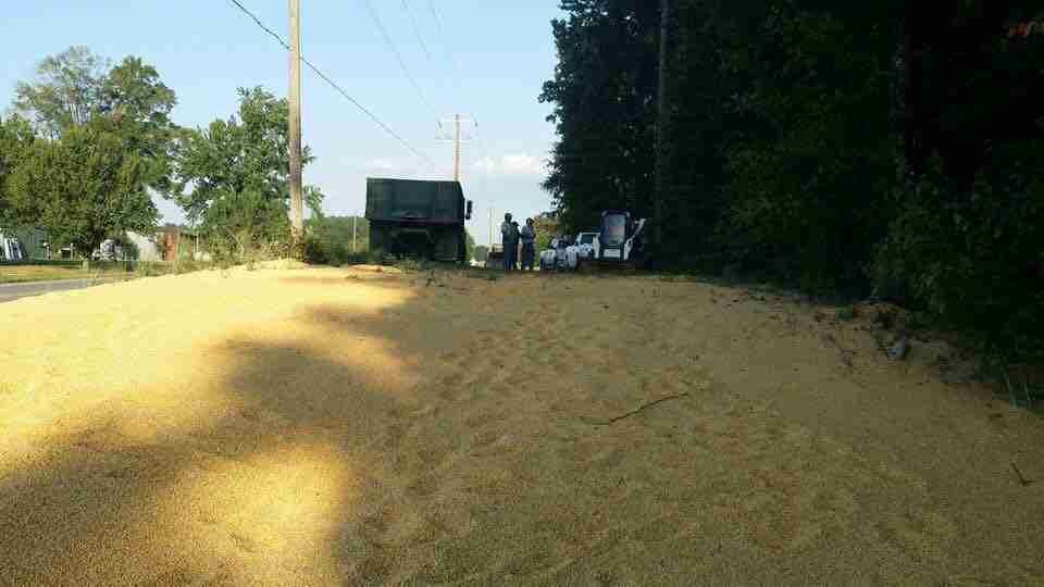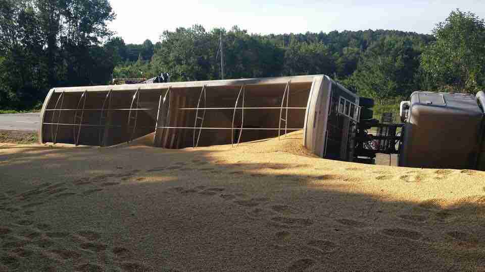 That accident occurred in the exact same location where an 18 wheeler overturned just last week. Traffic was backed up for an extended period of time as crews worked to clear away the trailer’s payload, which in this case was corn, and remove the 1996 Peterbilt.