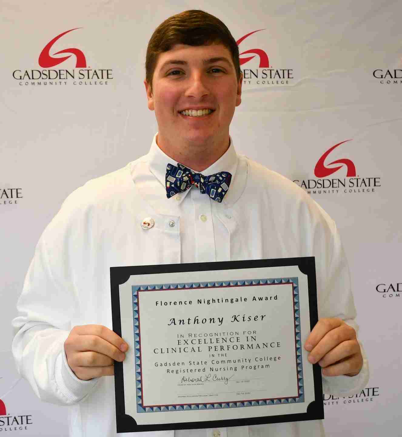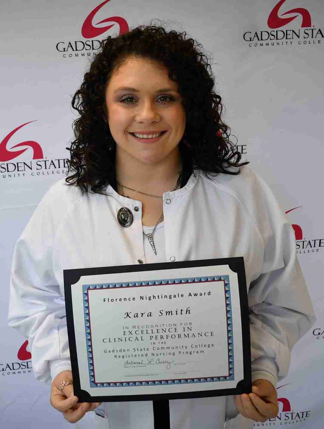 Each semester, select registered nursing students are presented with the highly-coveted Florence Nightingale Award, which recognizes those who are the most committed to caring and compassionate nursing care. Winners were selected from each cohort at Gadsden State Cherokee — one from the daytime program and one from the evening program. Kara Smith of Cedartown, Ga., was the winner for the day program, and Anthony Kiser of Piedmont was the winner for the evening program.