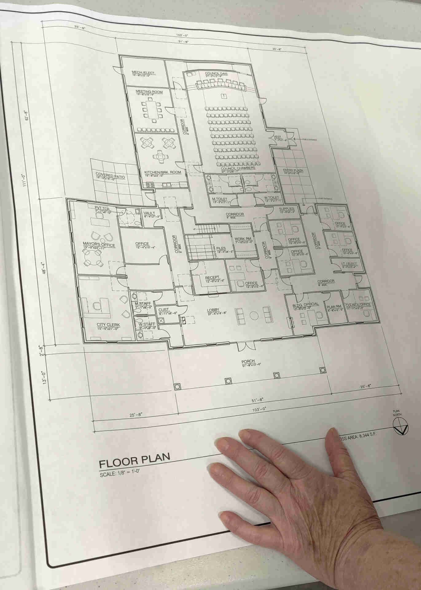 The current blueprints indicate a building of eight thousand three hundred and forty four square feet that houses 6 general purpose offices, the mayor’s office, the city clerk’s office, the building official’s office, and the council’s office.