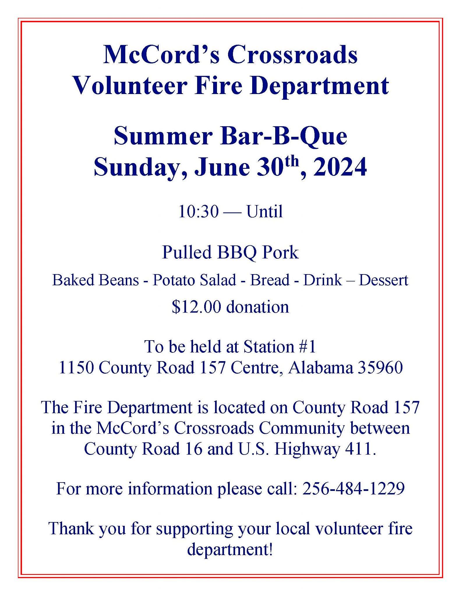 McCord’s Crossroads Volunteer Fire Department – Summer BBQ – June 30th