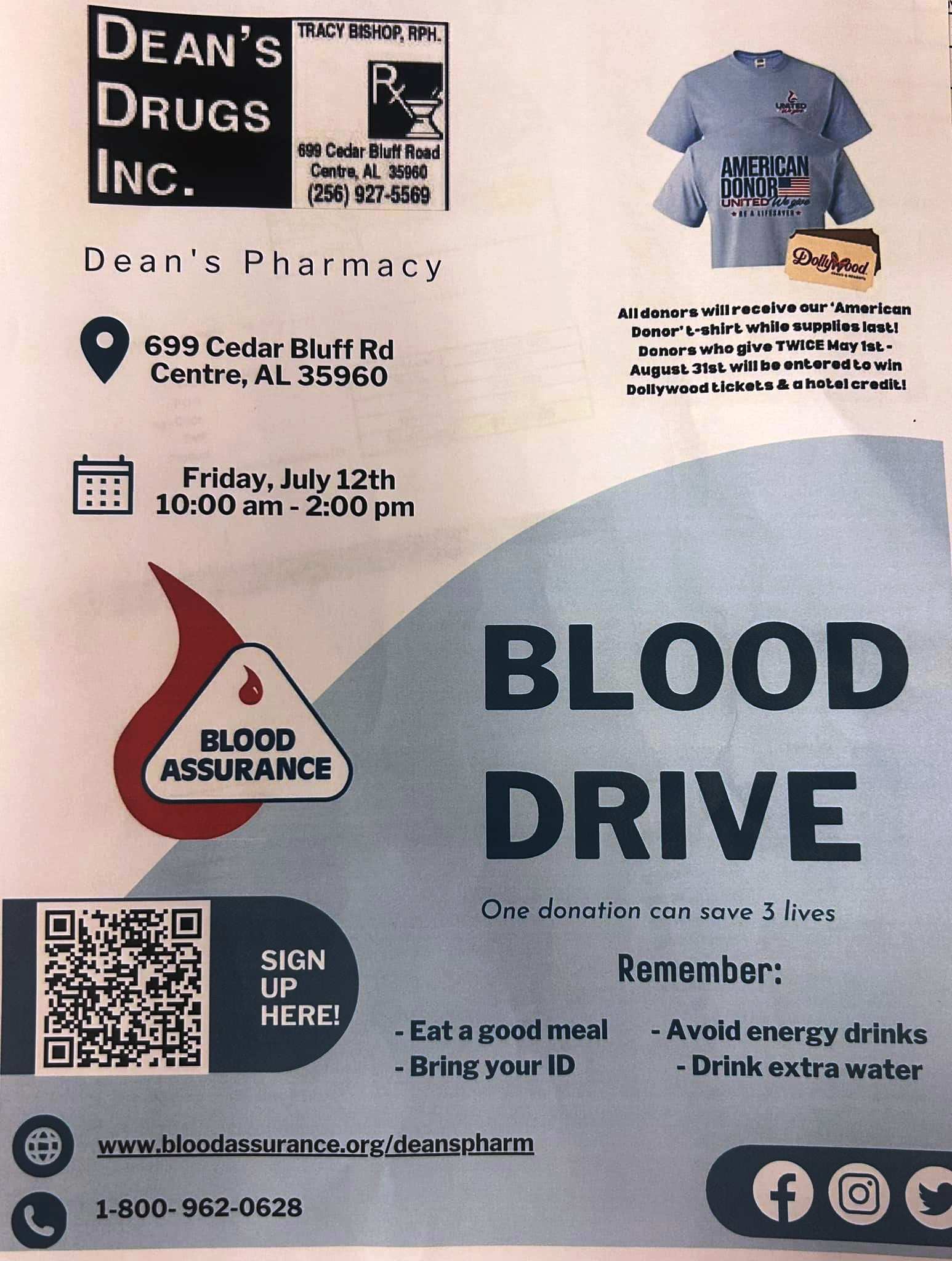 Blood Assurance Blood Drive at Dean’s Pharmacy in Centre – July 12th