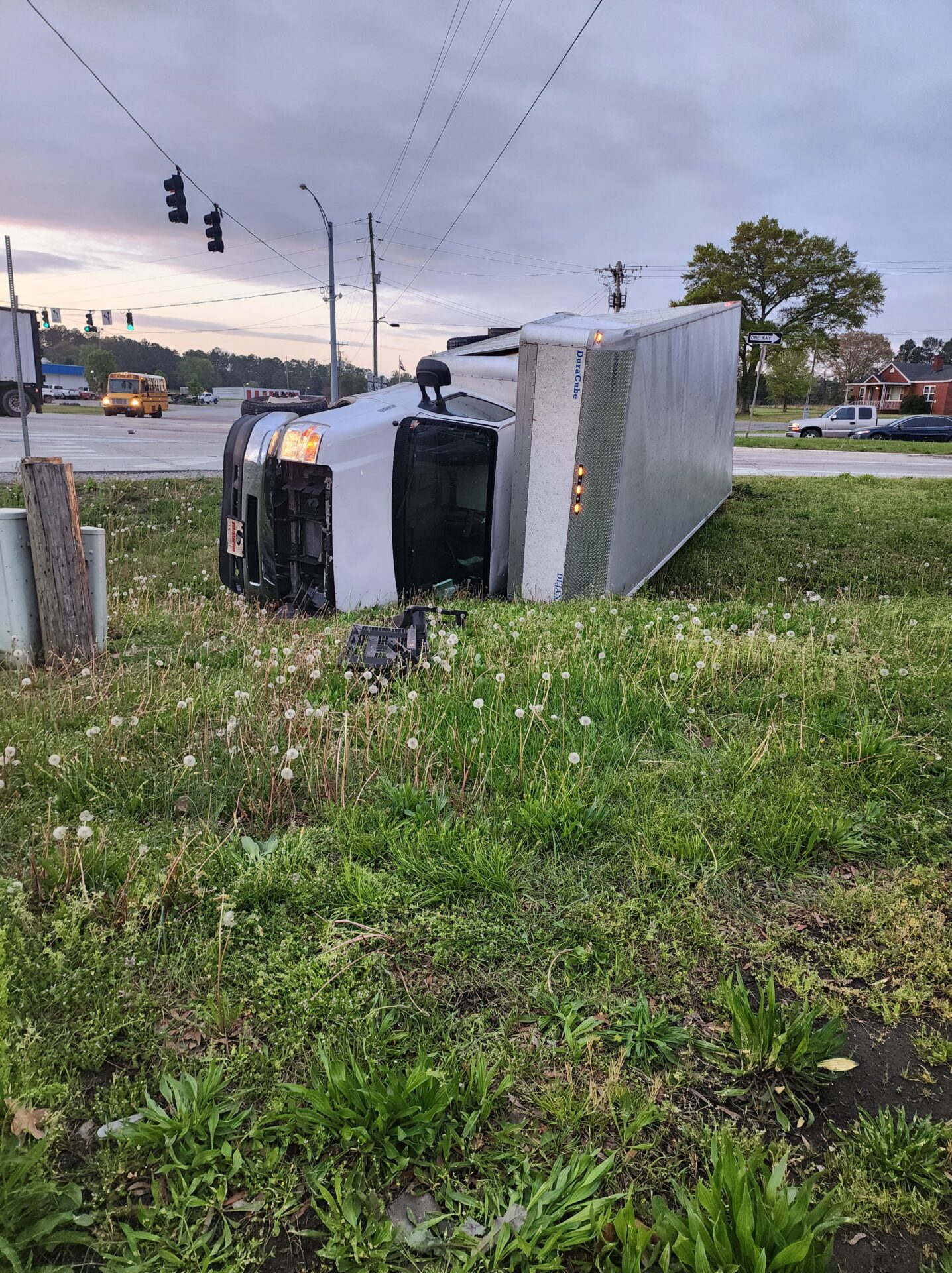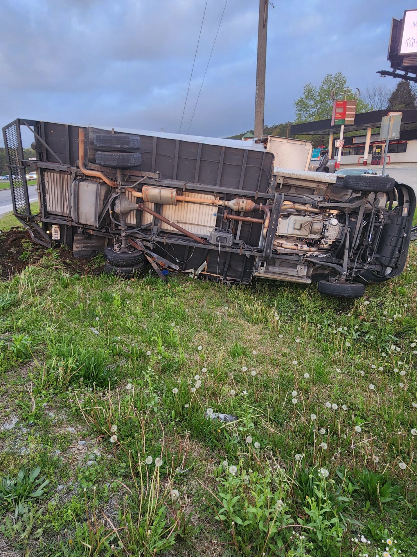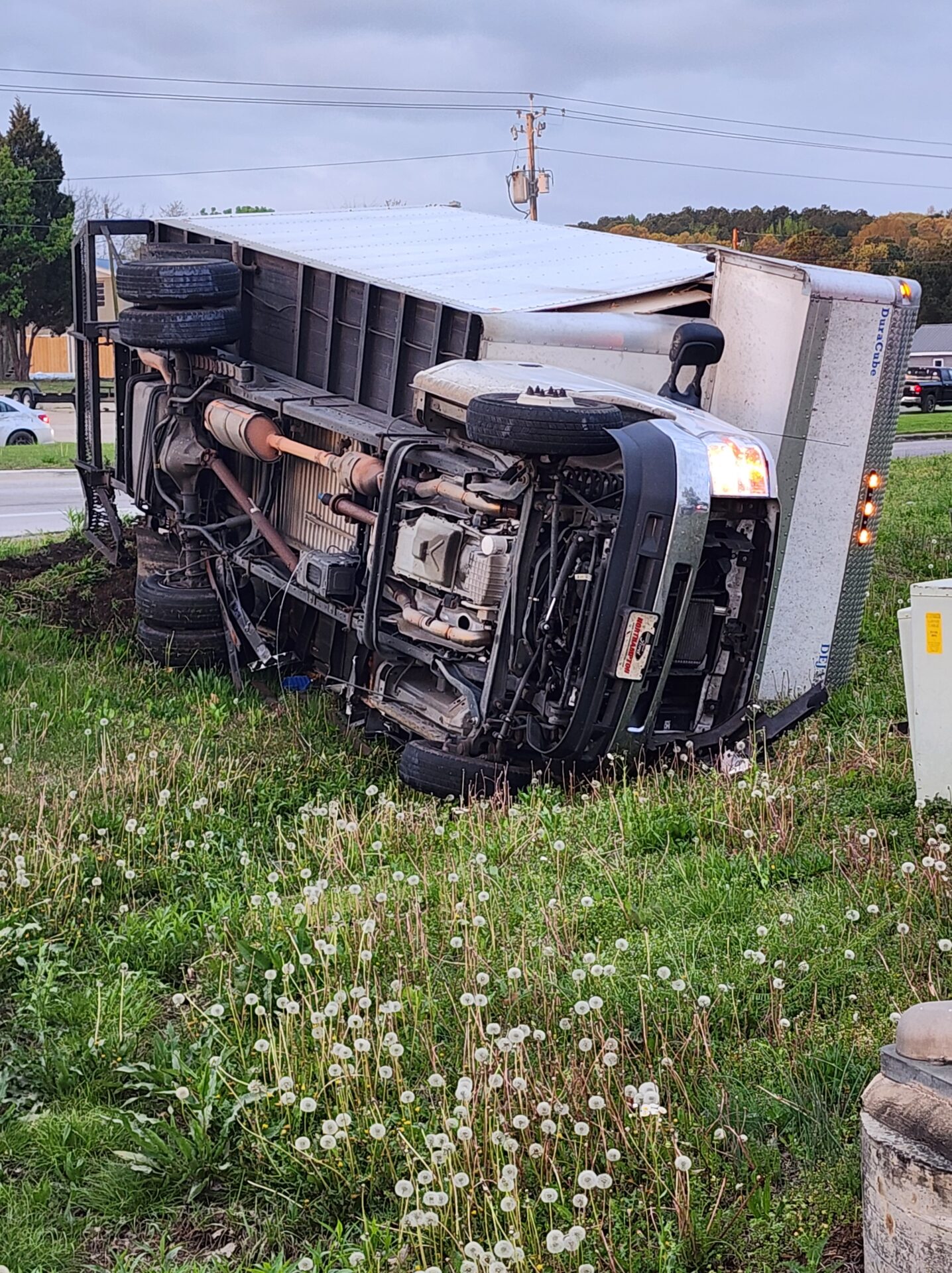 The box truck ended up overturned in the ditch at the southwest corner of the southbound lane of the intersection.