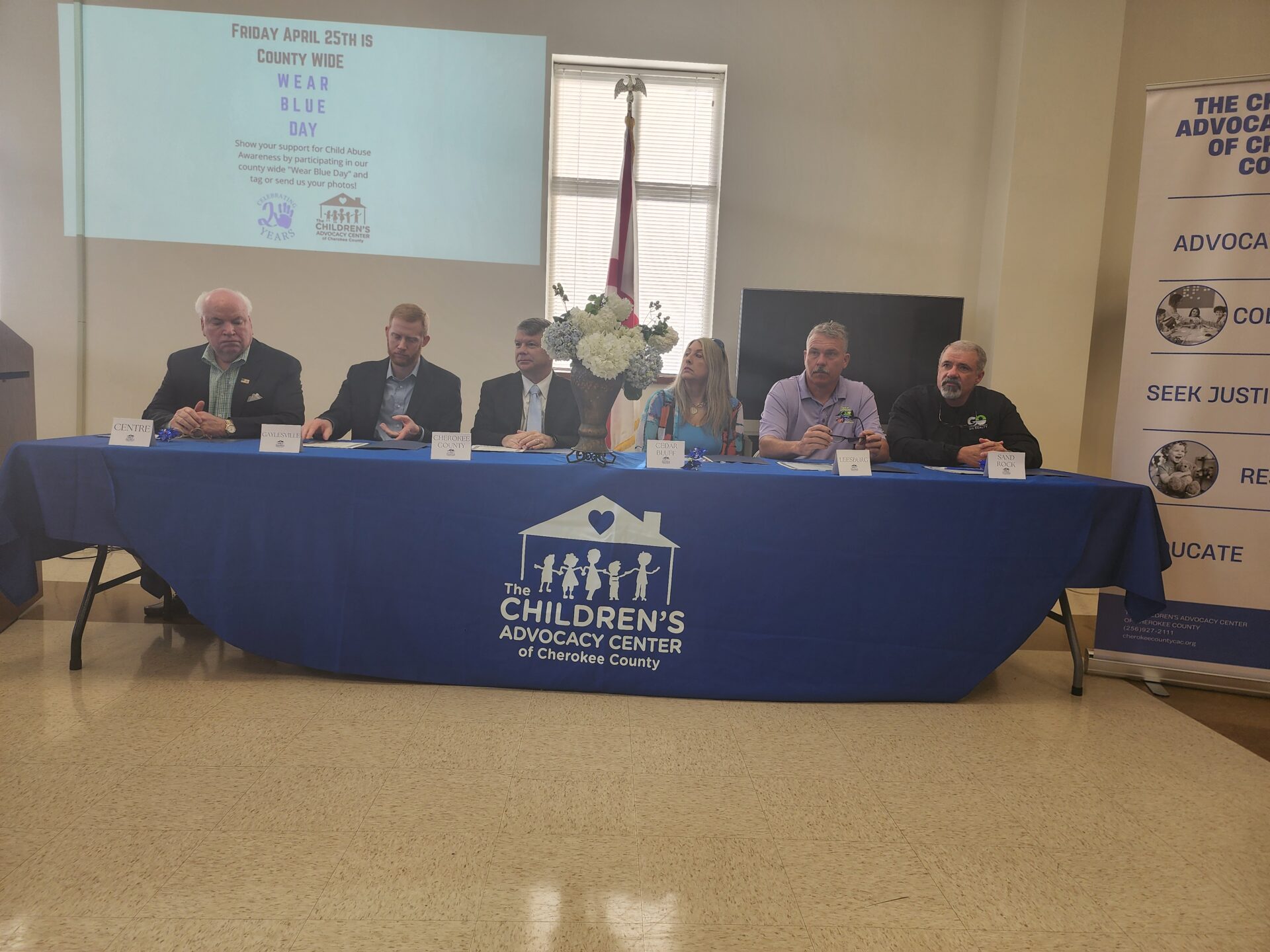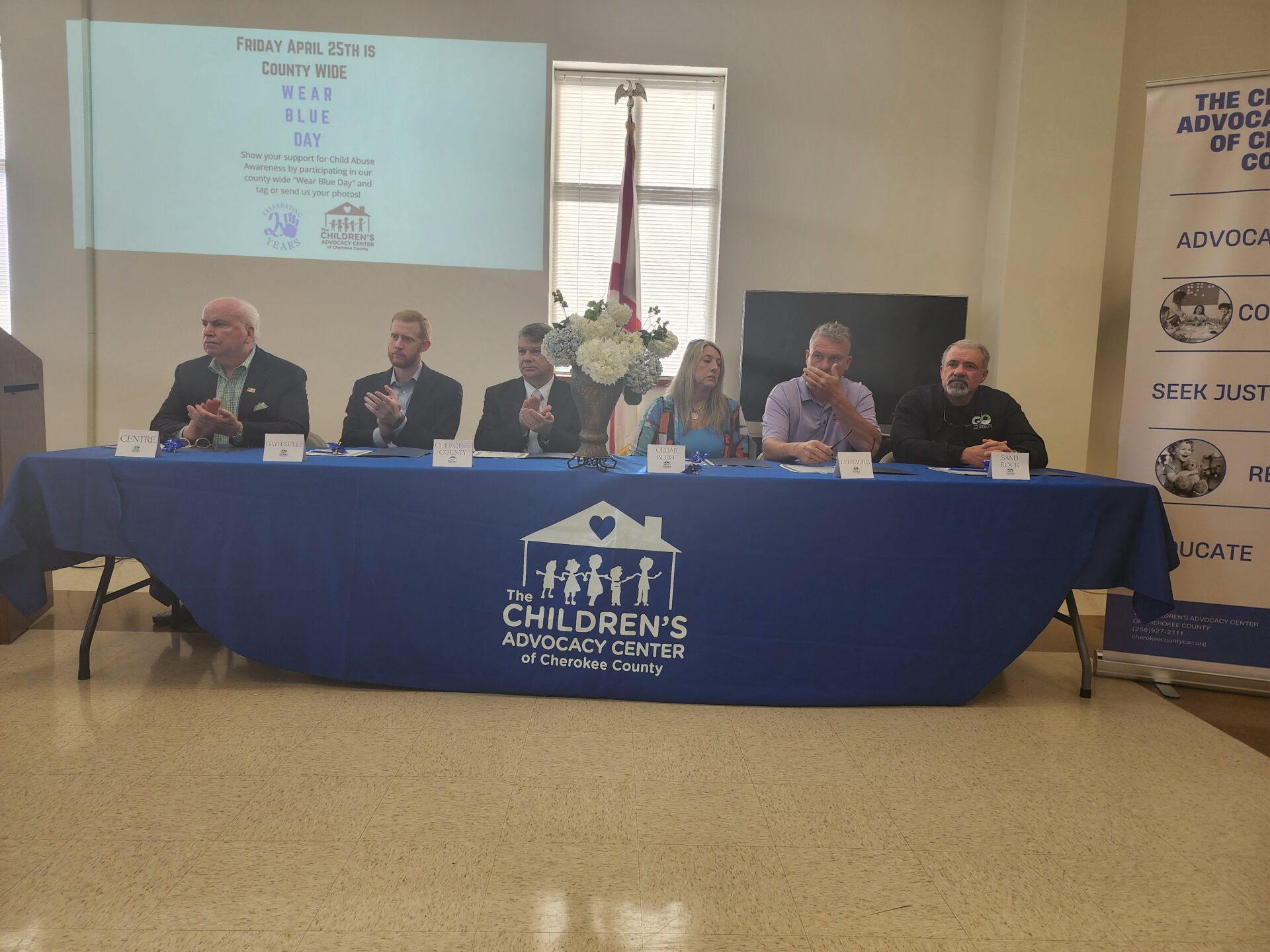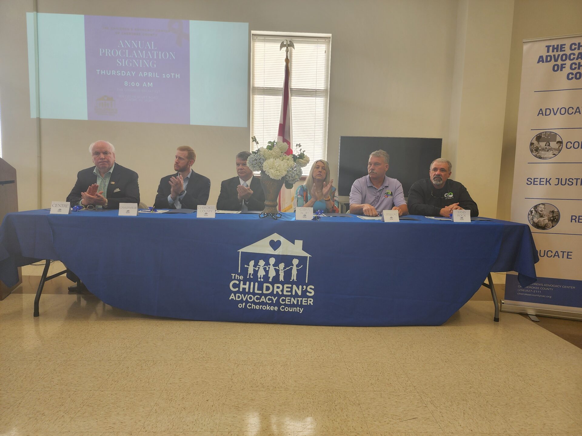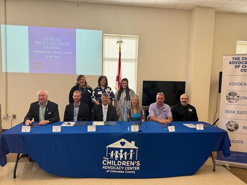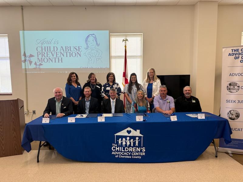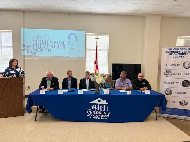 Centre- The Cherokee Chamber held their monthly breakfast on Thursday, April 10th in Conjunction with the Children’s Advocacy Center of Cherokee County. At the meeting, the Annual Proclamation Signing in regards to April’s Child Abuse Awareness month was held. Mayors and representatives from Cedar Bluff, Centre, Gaylesville, Leesburg, and Sand Rock, as well as from the Cherokee County Commission signed proclamations showing their support for the agency and victims of child abuse.