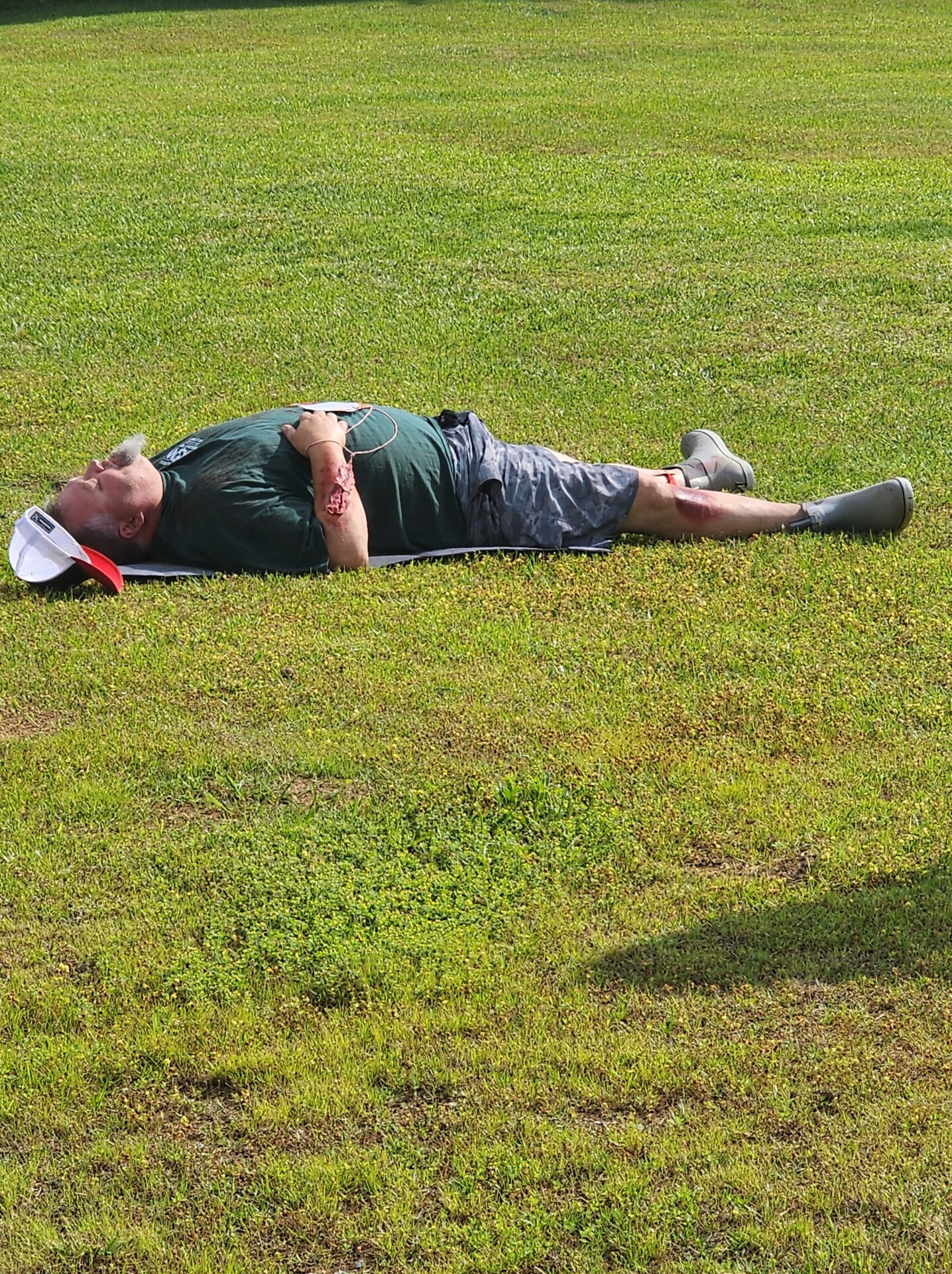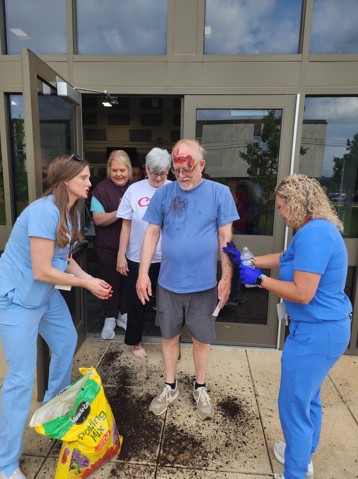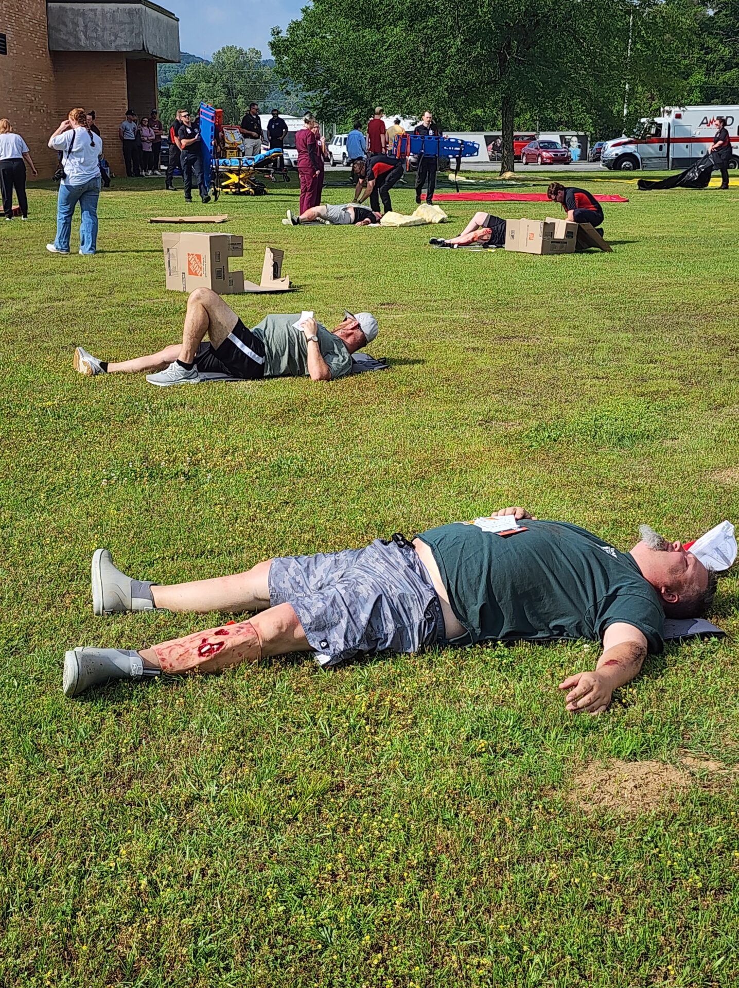 Meanwhile, volunteers assigned as “victims” were briefed in another building. Many were fitted with realistic prosthetic injuries and instructed on their roles. Some were even covered in dirt for added realism. When the simulation began, victims took their places in the field—some under debris, others in a crash simulator—and began acting out their scenarios.