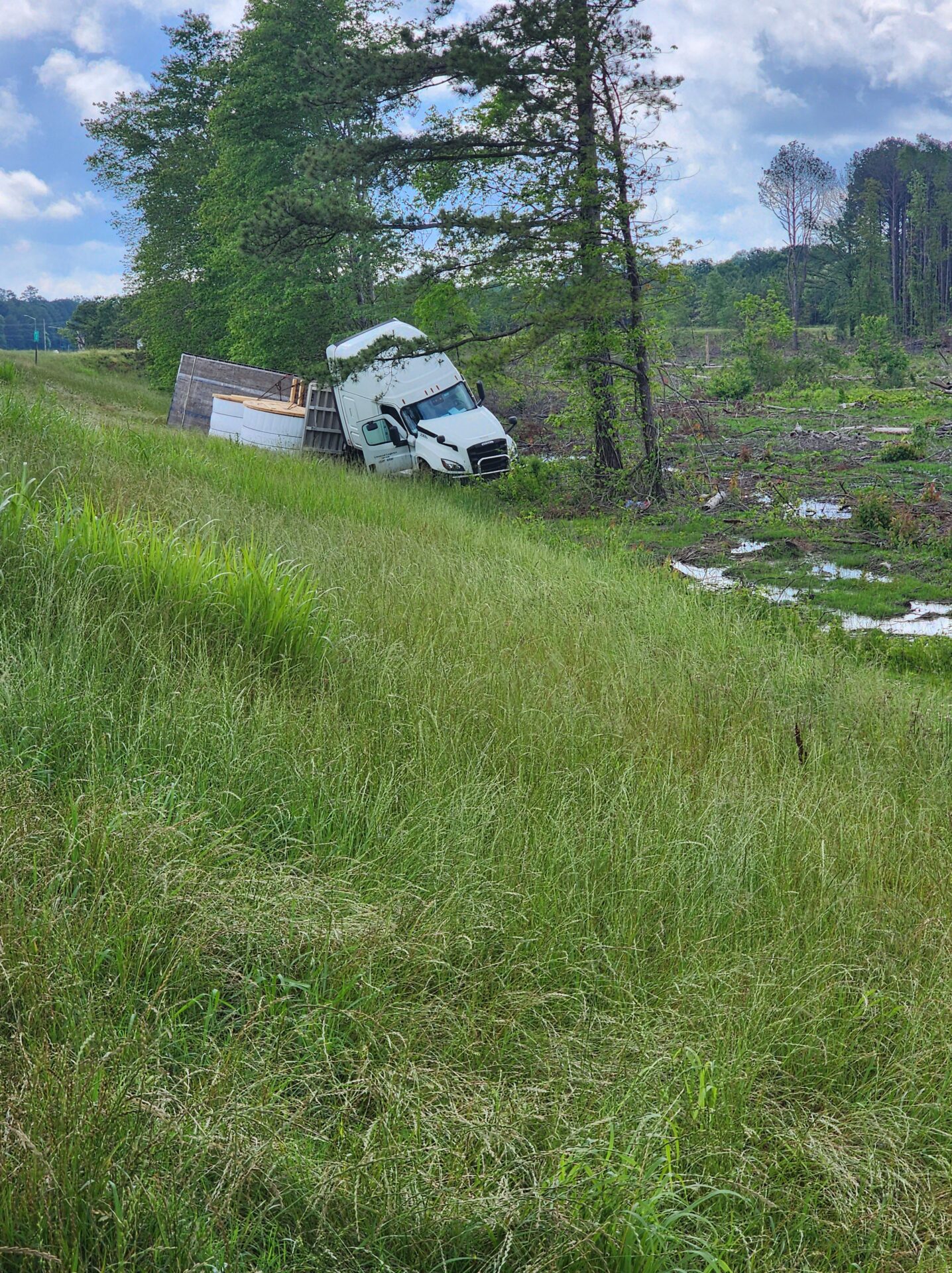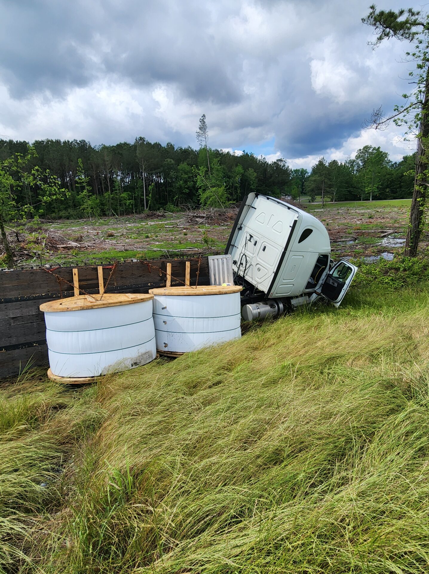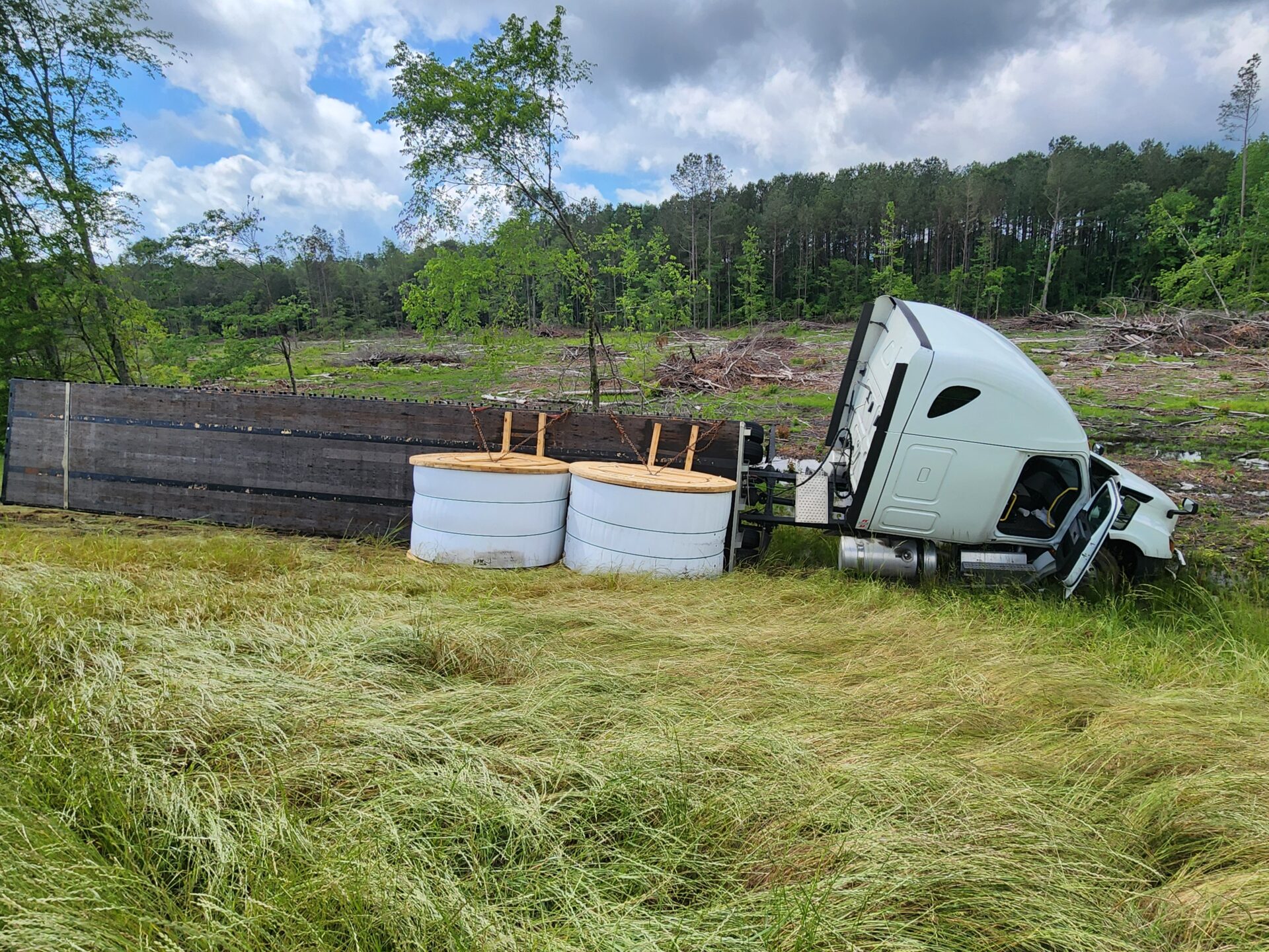 Centre- A flatbed 18-wheeler hauling fiber optic cable wrecked around 10:00 AM Tuesday on the bypass in Centre. The truck, heading south toward Highway 411, reportedly crossed all four lanes of traffic before going off the embankment on the opposite side. Fortunately, no other vehicles were involved, and no serious injuries were reported.