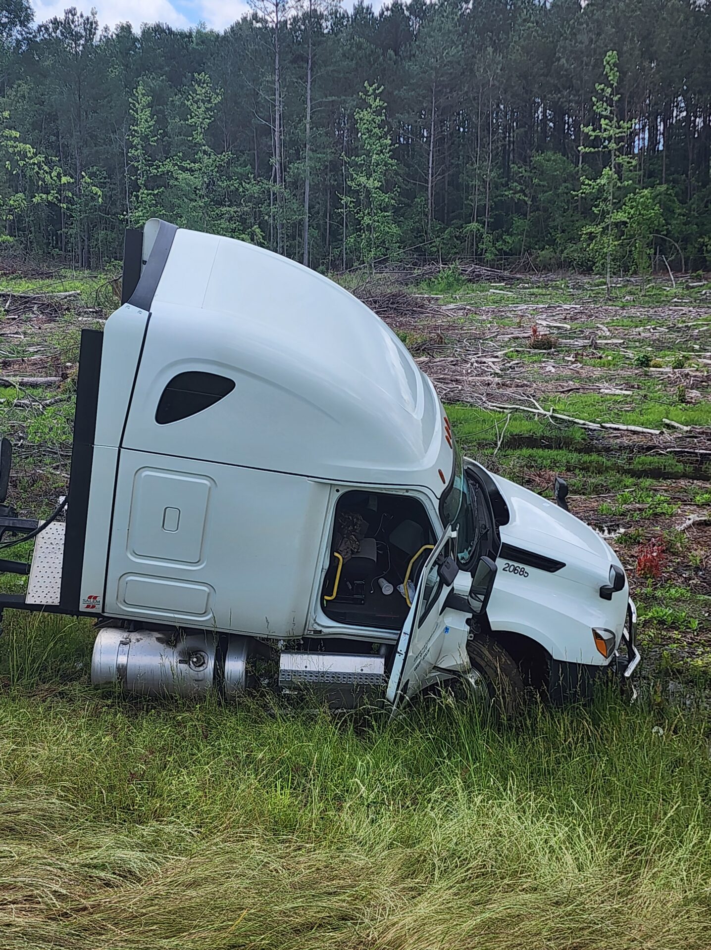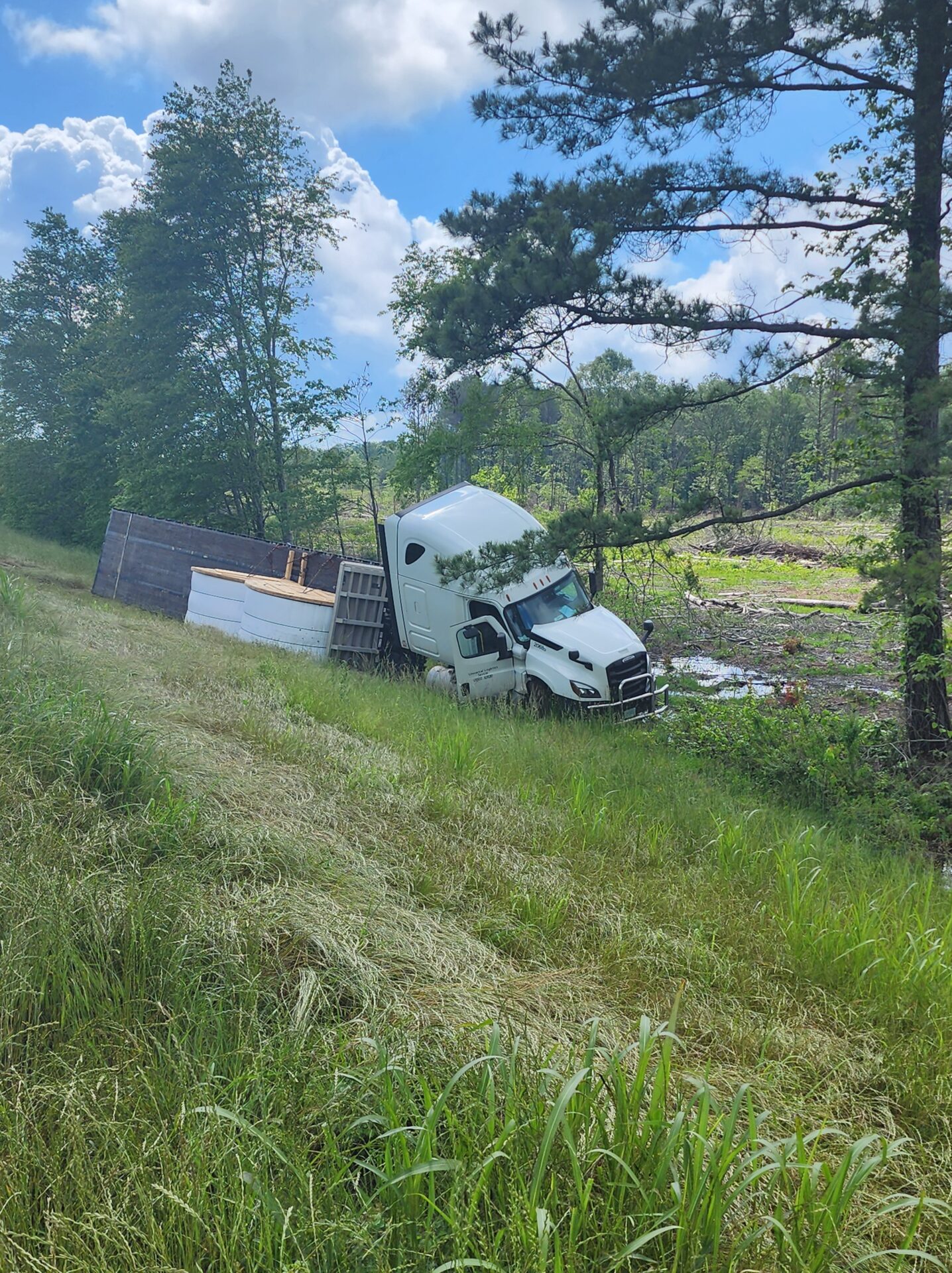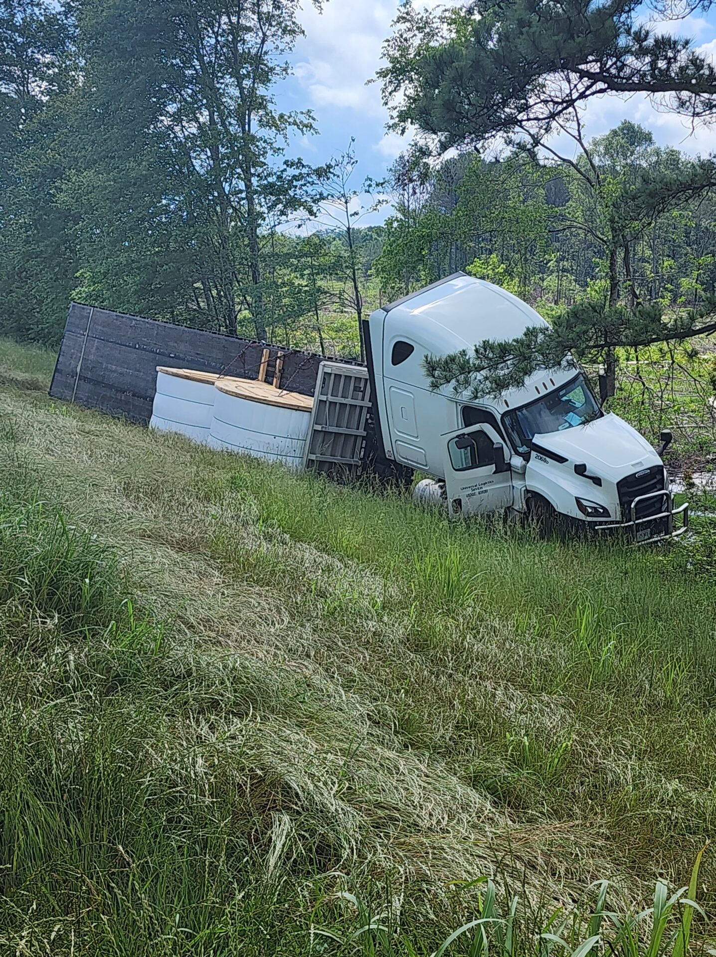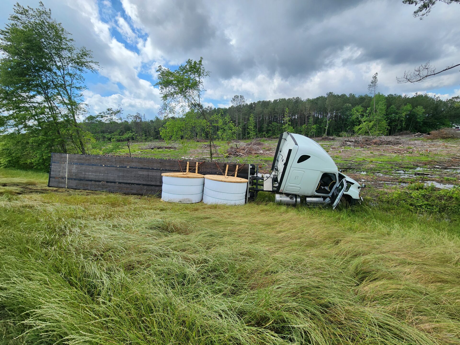 Centre- A flatbed 18-wheeler hauling fiber optic cable wrecked around 10:00 AM Tuesday on the bypass in Centre. The truck, heading south toward Highway 411, reportedly crossed all four lanes of traffic before going off the embankment on the opposite side. Fortunately, no other vehicles were involved, and no serious injuries were reported.