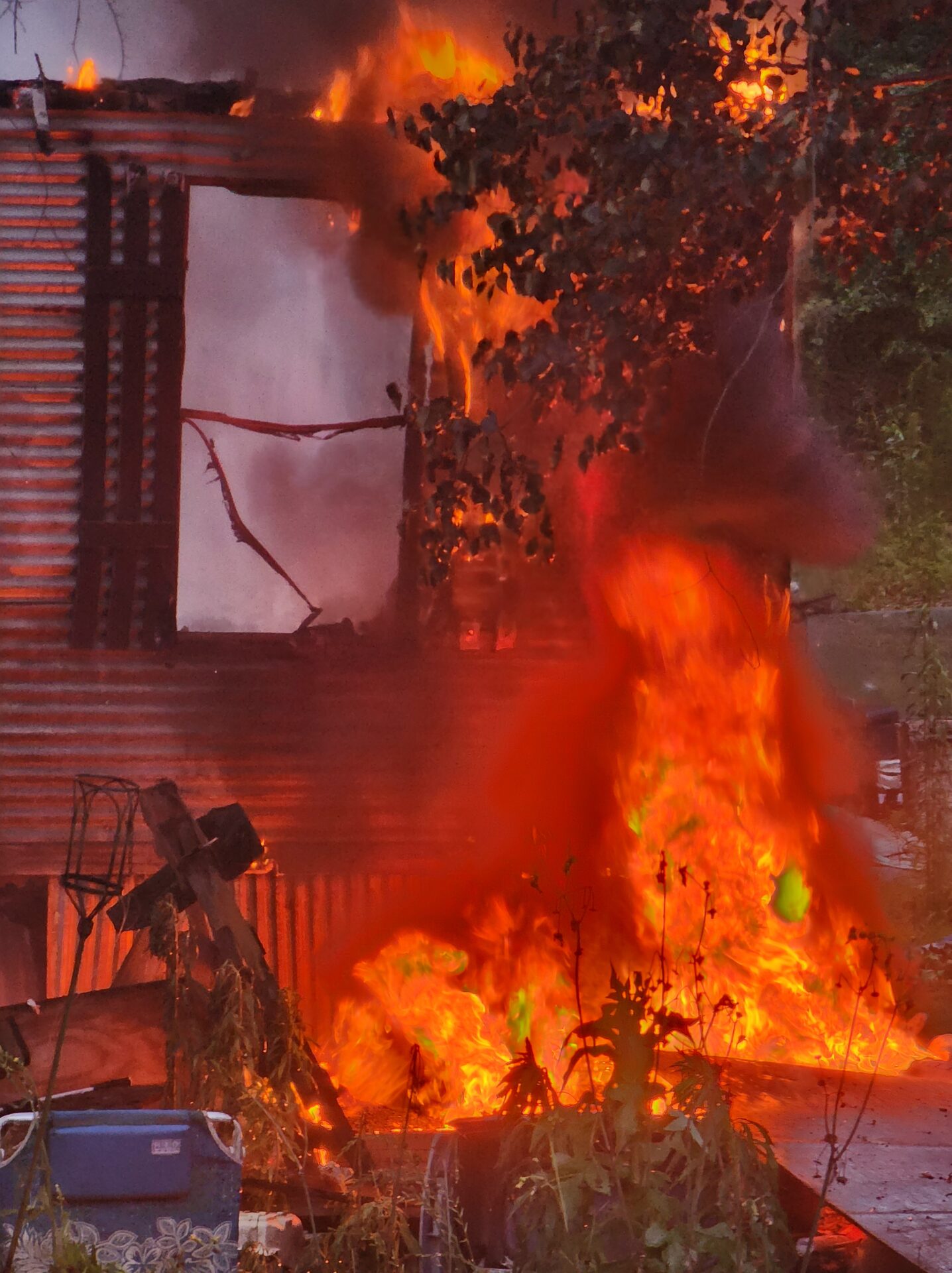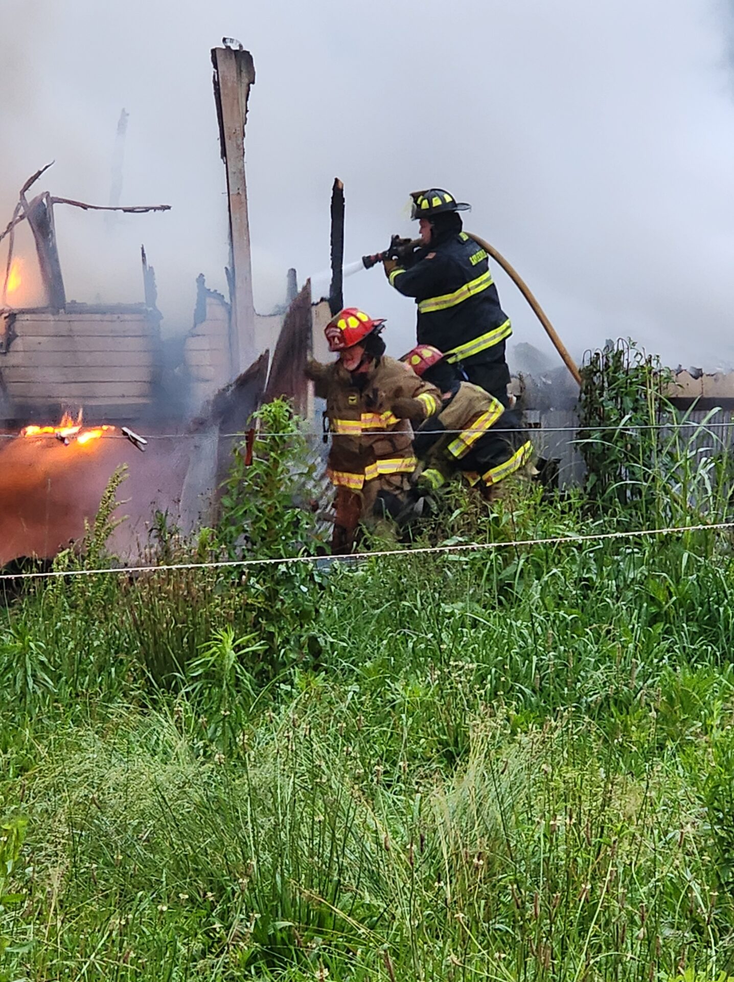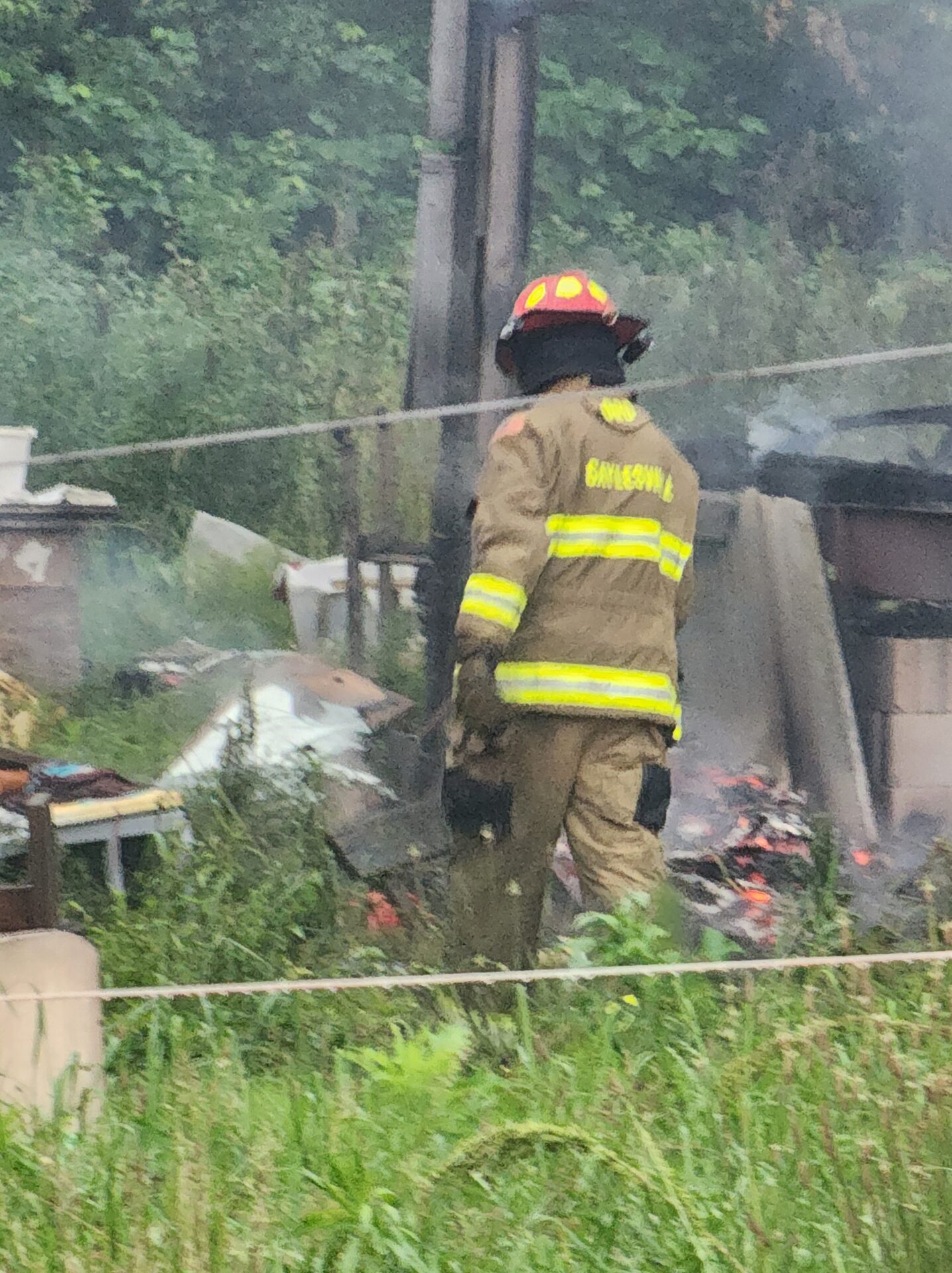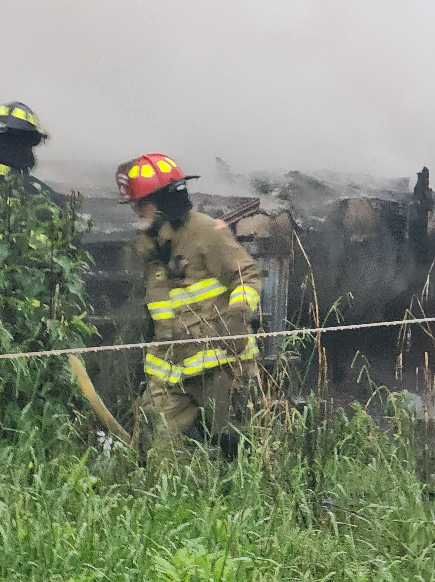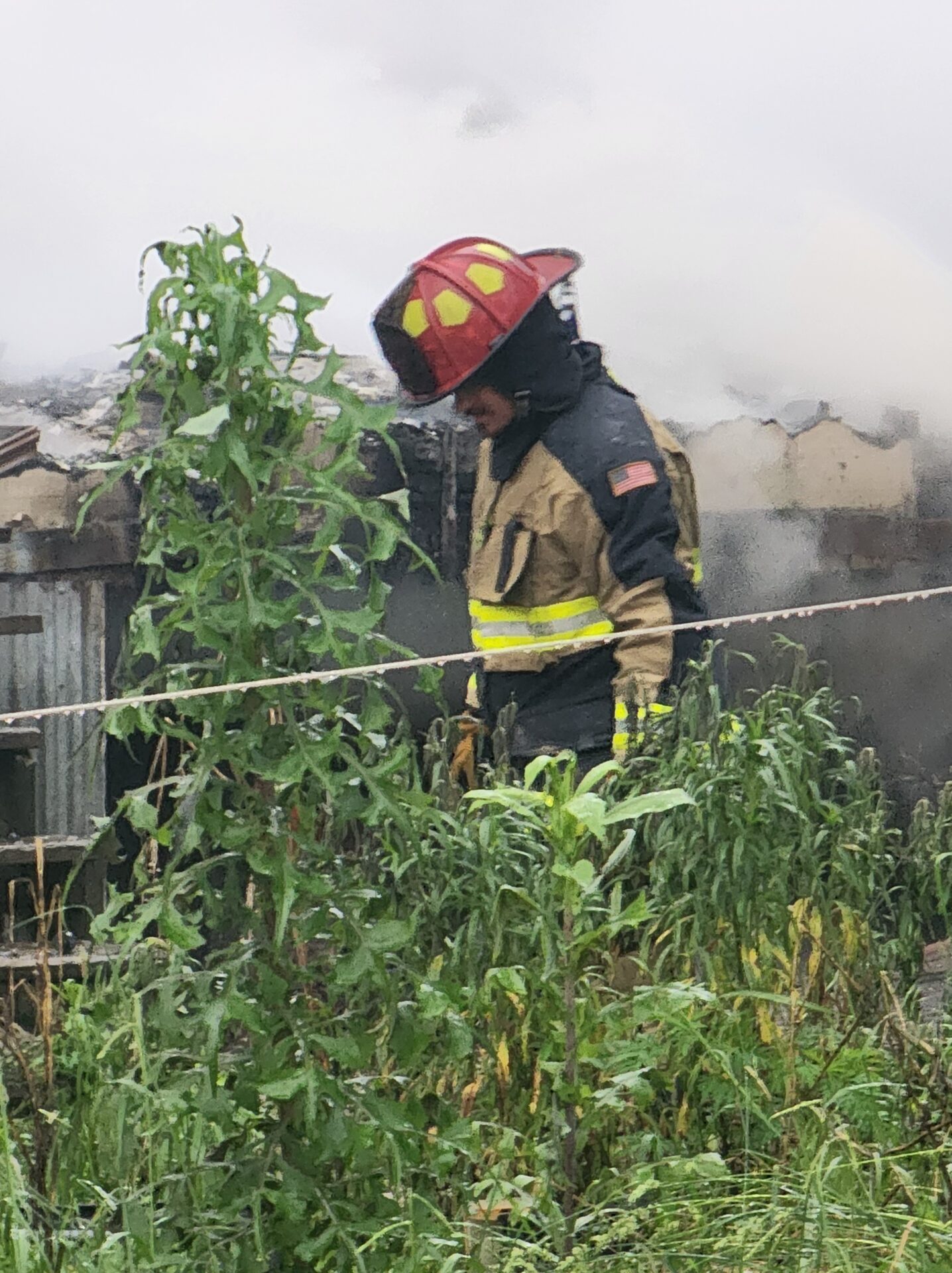 Firefighters battled the blaze in tough conditions, as heavy rain initially hampered efforts—eventually tapering off into a light drizzle as crews worked.