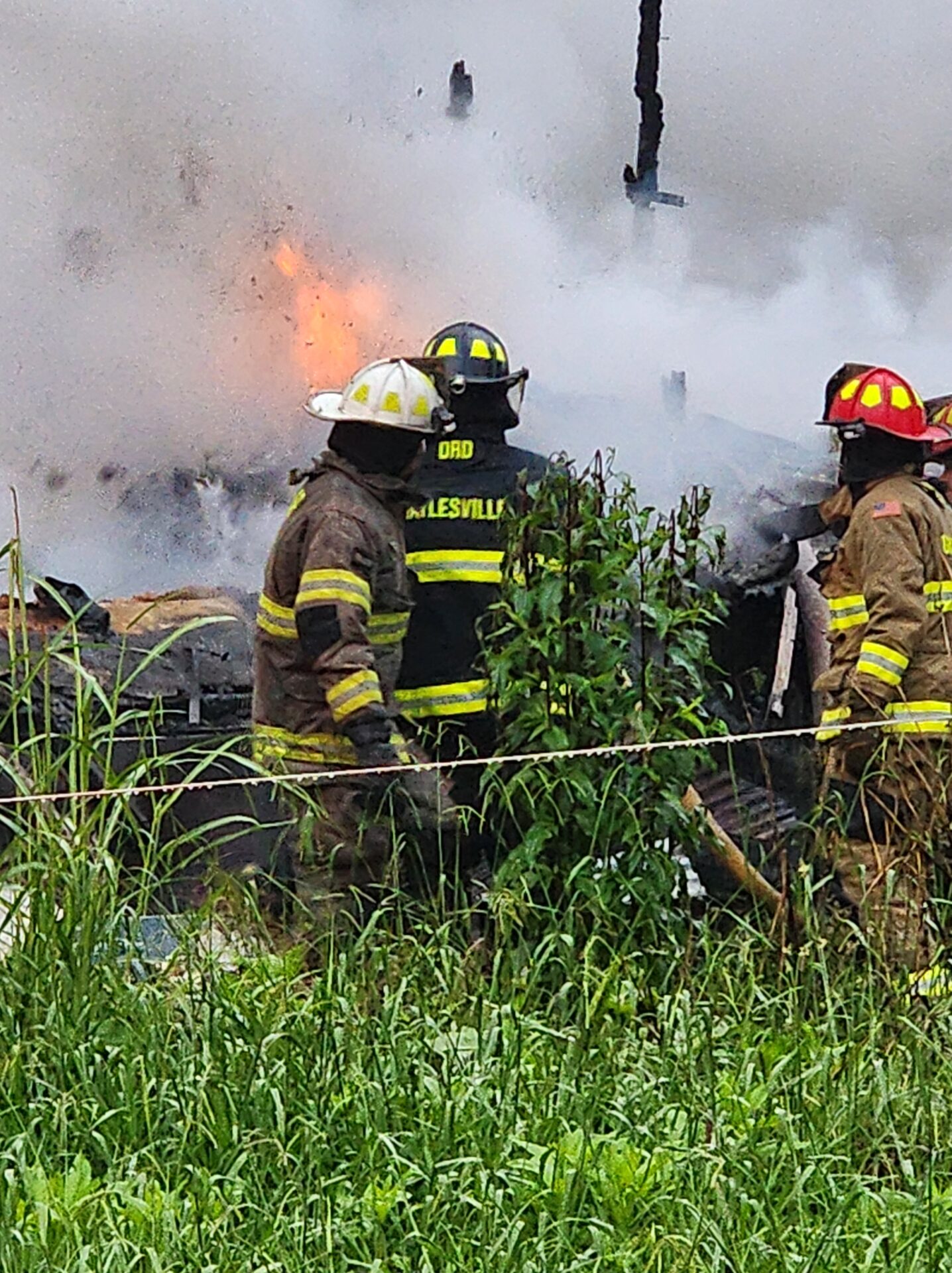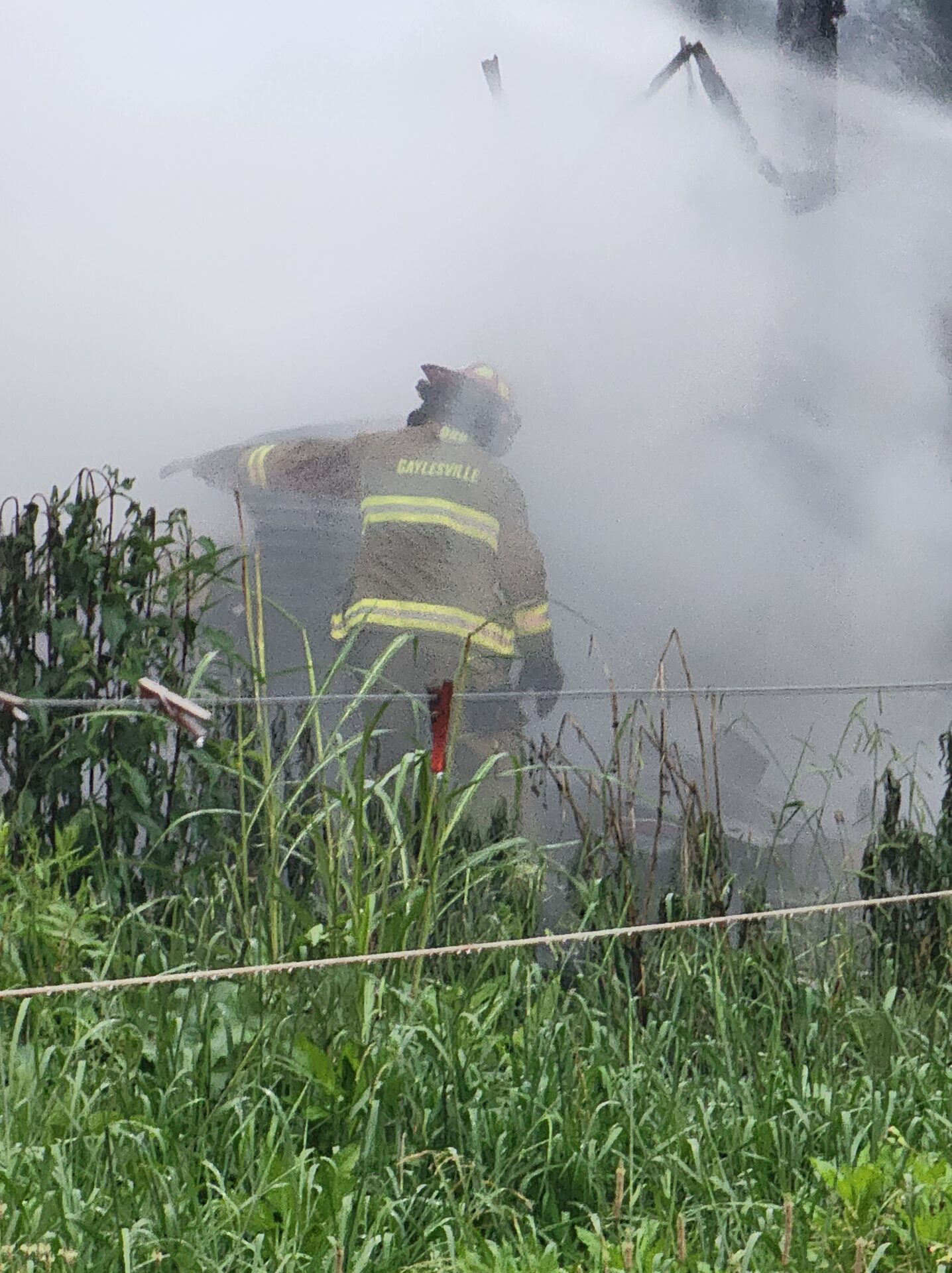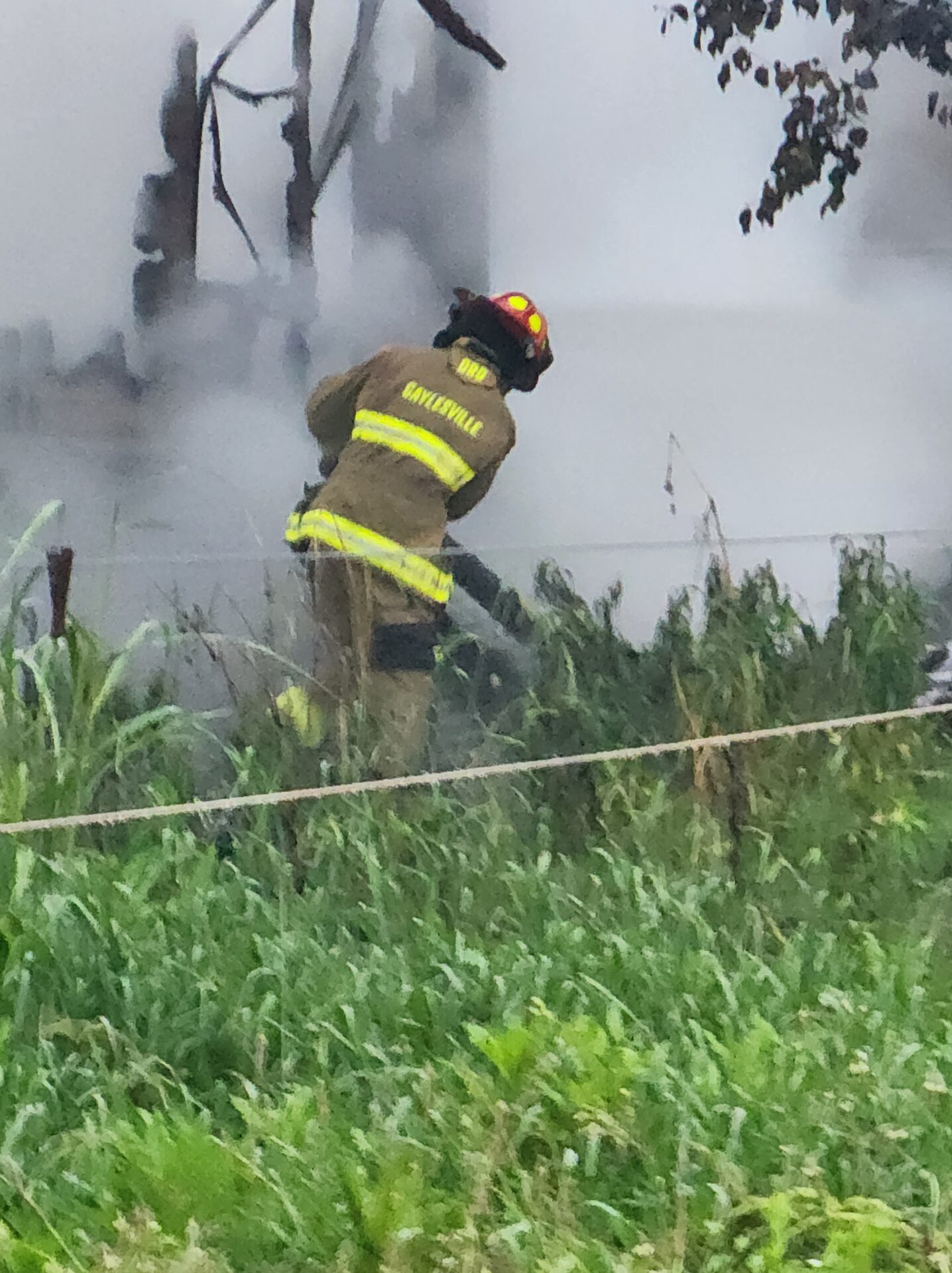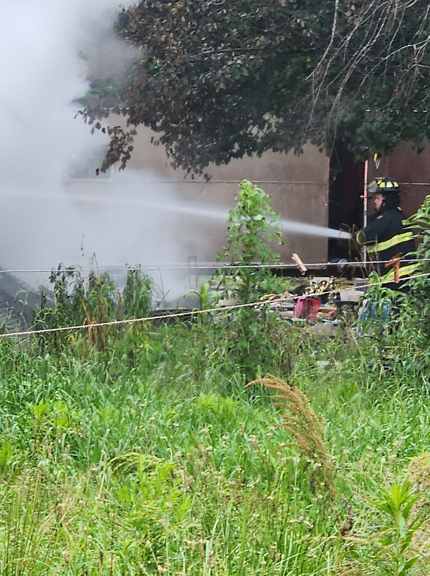 Firefighters battled the blaze in tough conditions, as heavy rain initially hampered efforts—eventually tapering off into a light drizzle as crews worked.
