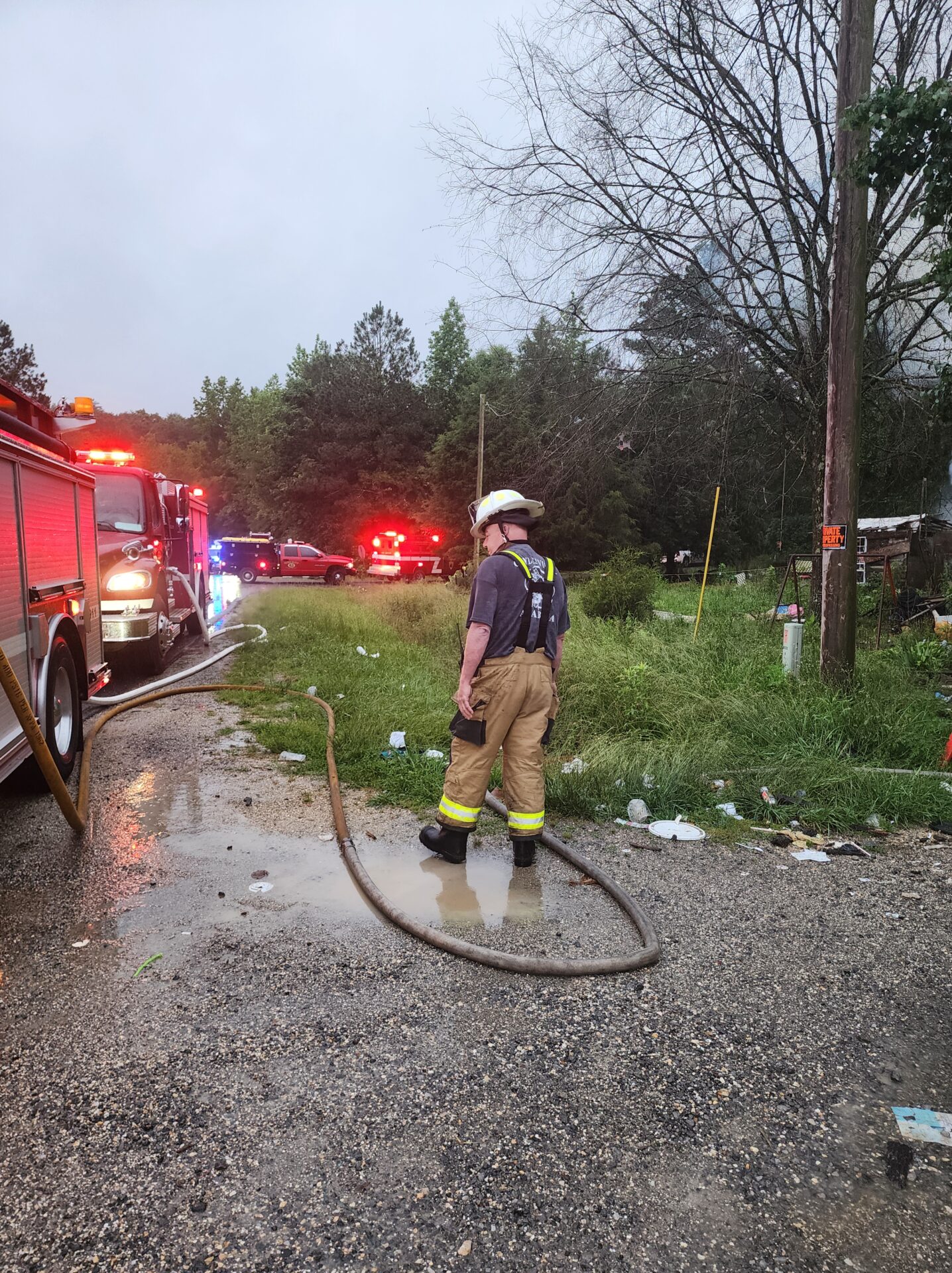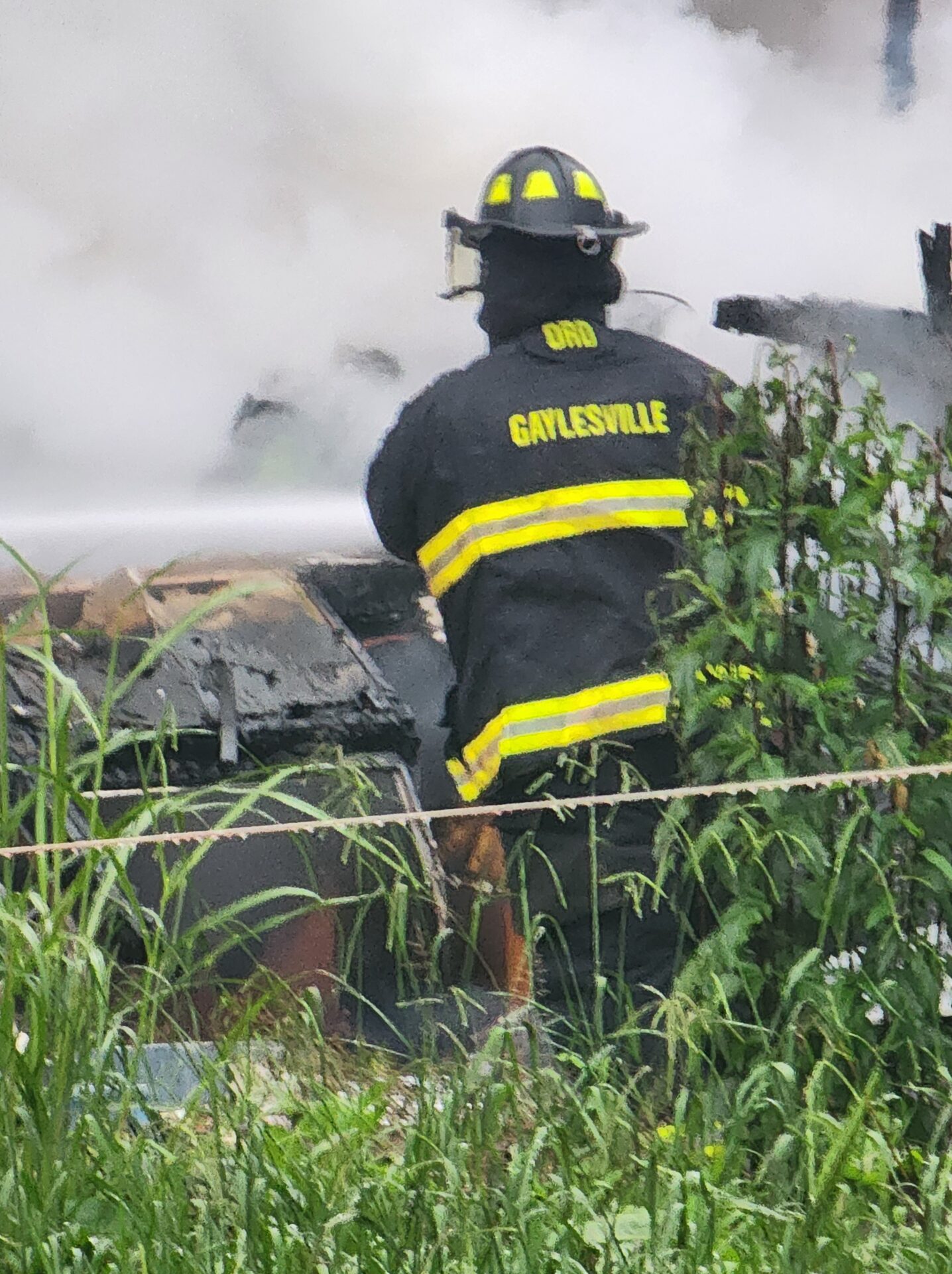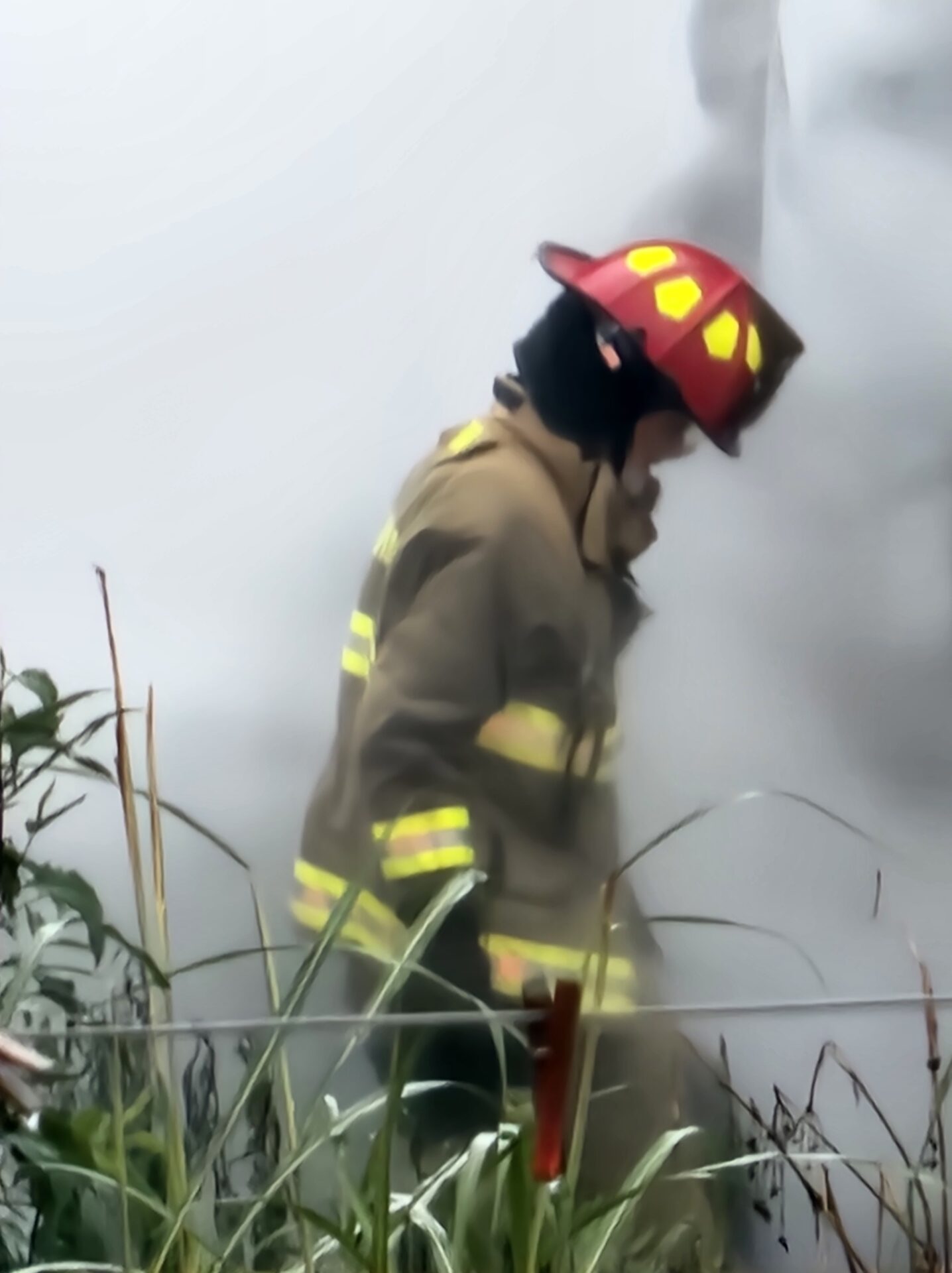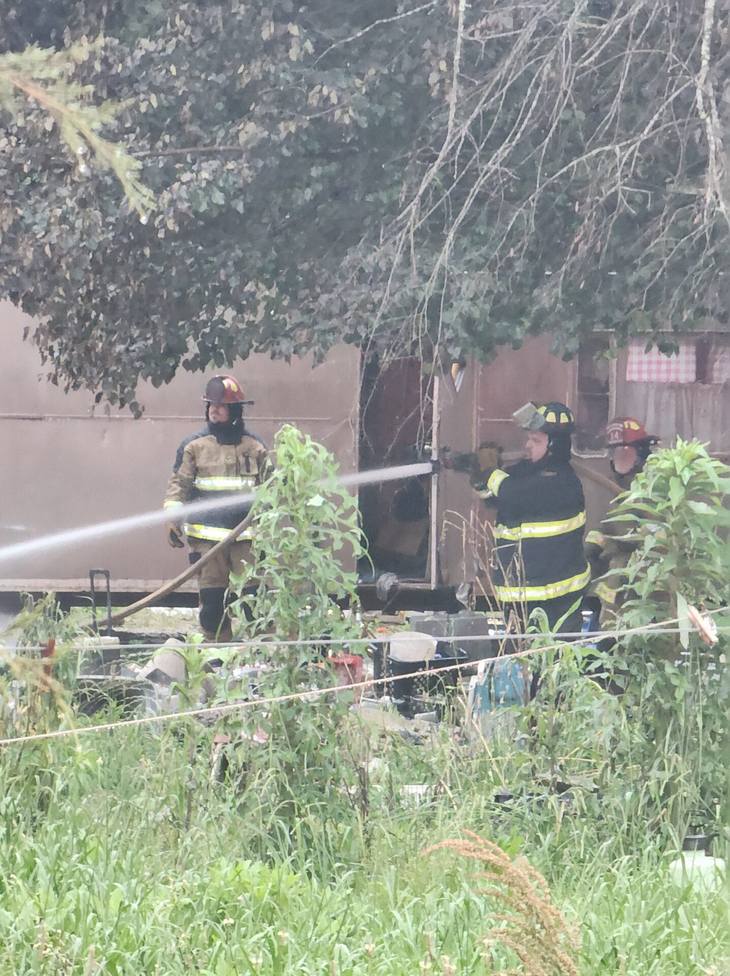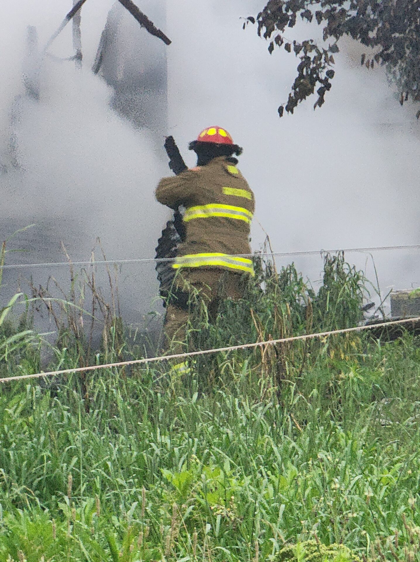 Firefighters battled the blaze in tough conditions, as heavy rain initially hampered efforts—eventually tapering off into a light drizzle as crews worked.