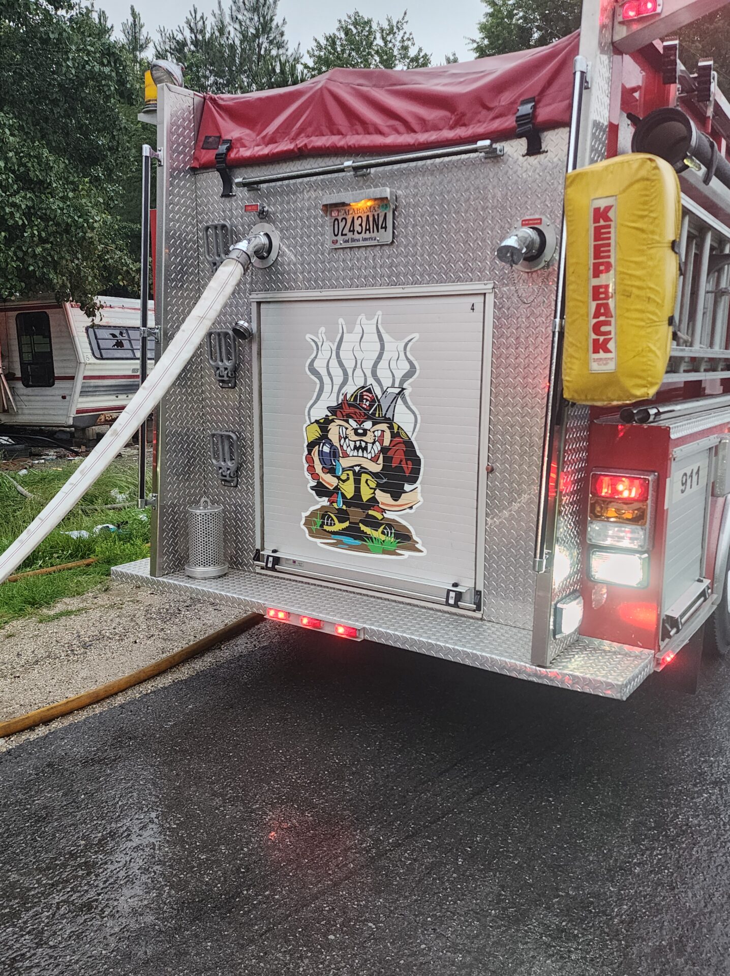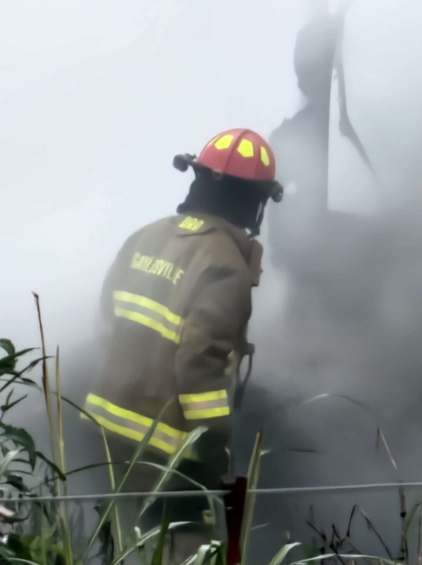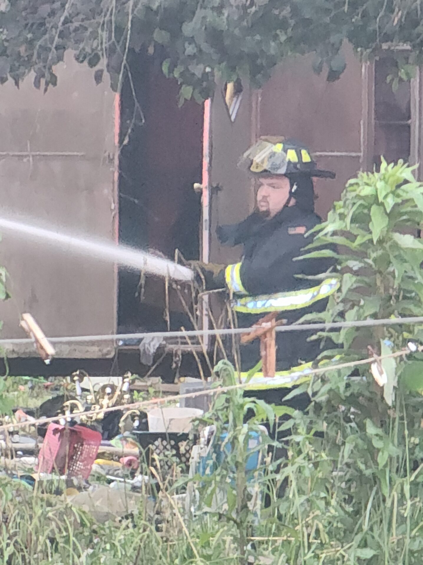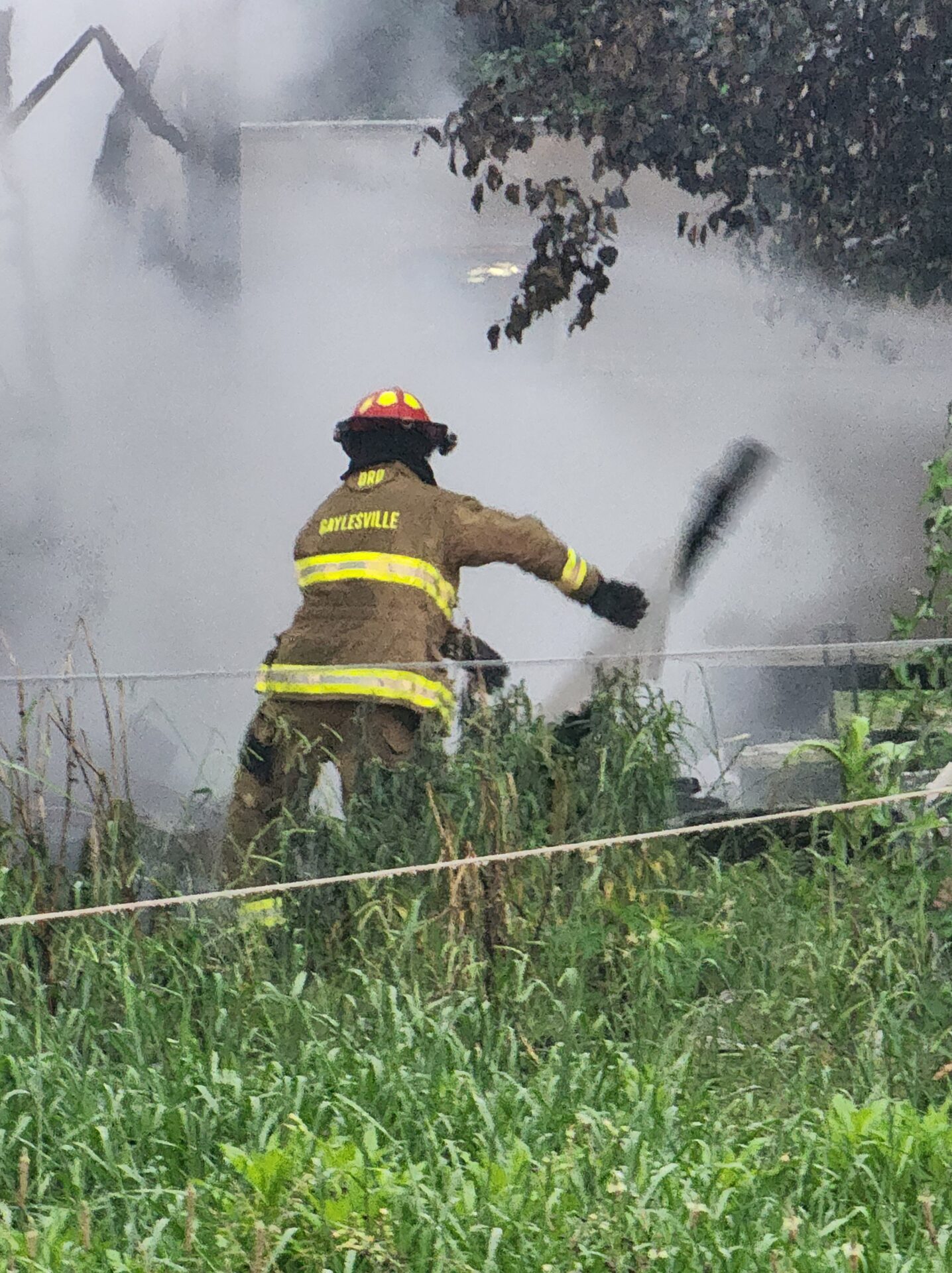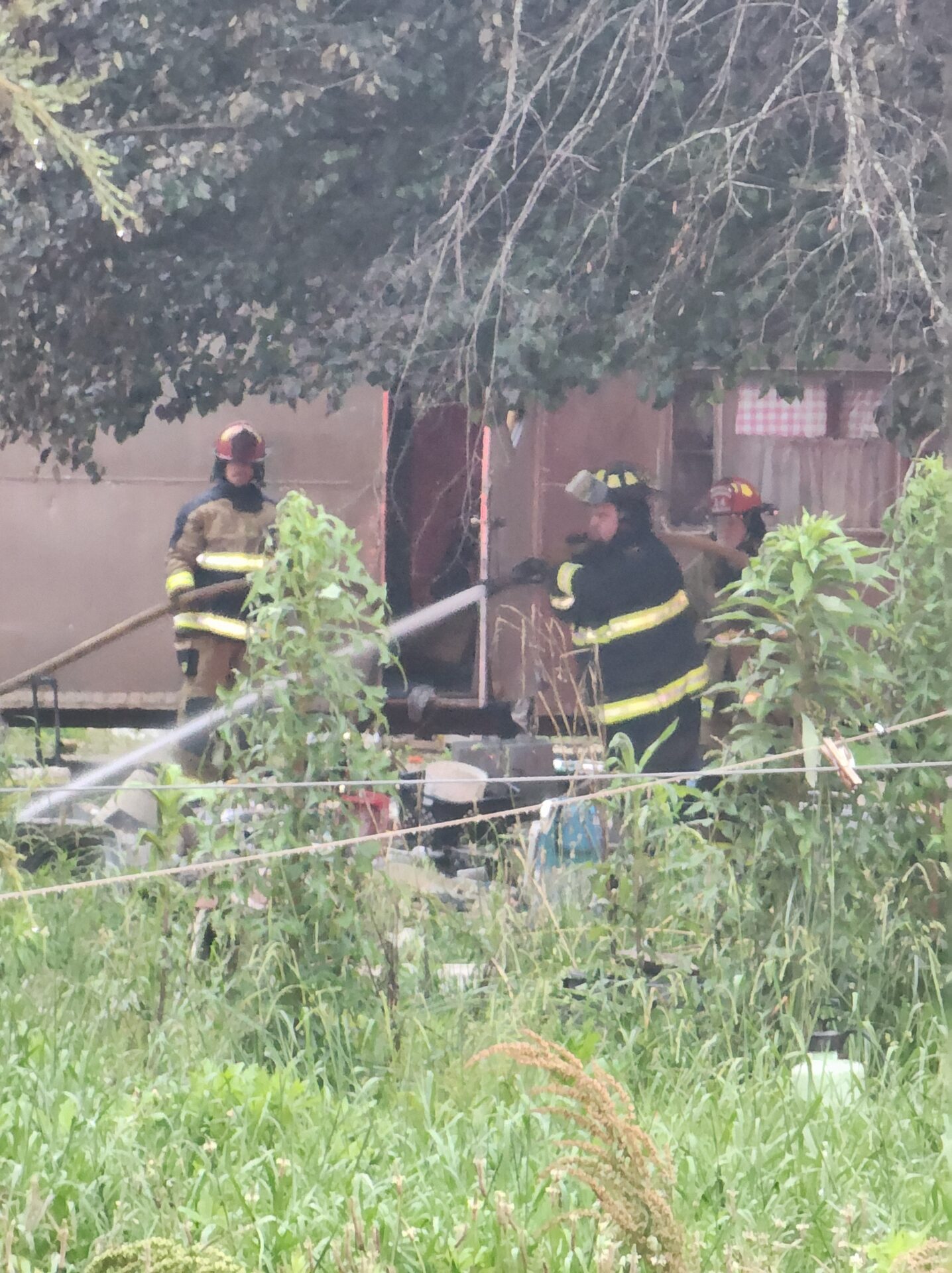 Firefighters battled the blaze in tough conditions, as heavy rain initially hampered efforts—eventually tapering off into a light drizzle as crews worked.