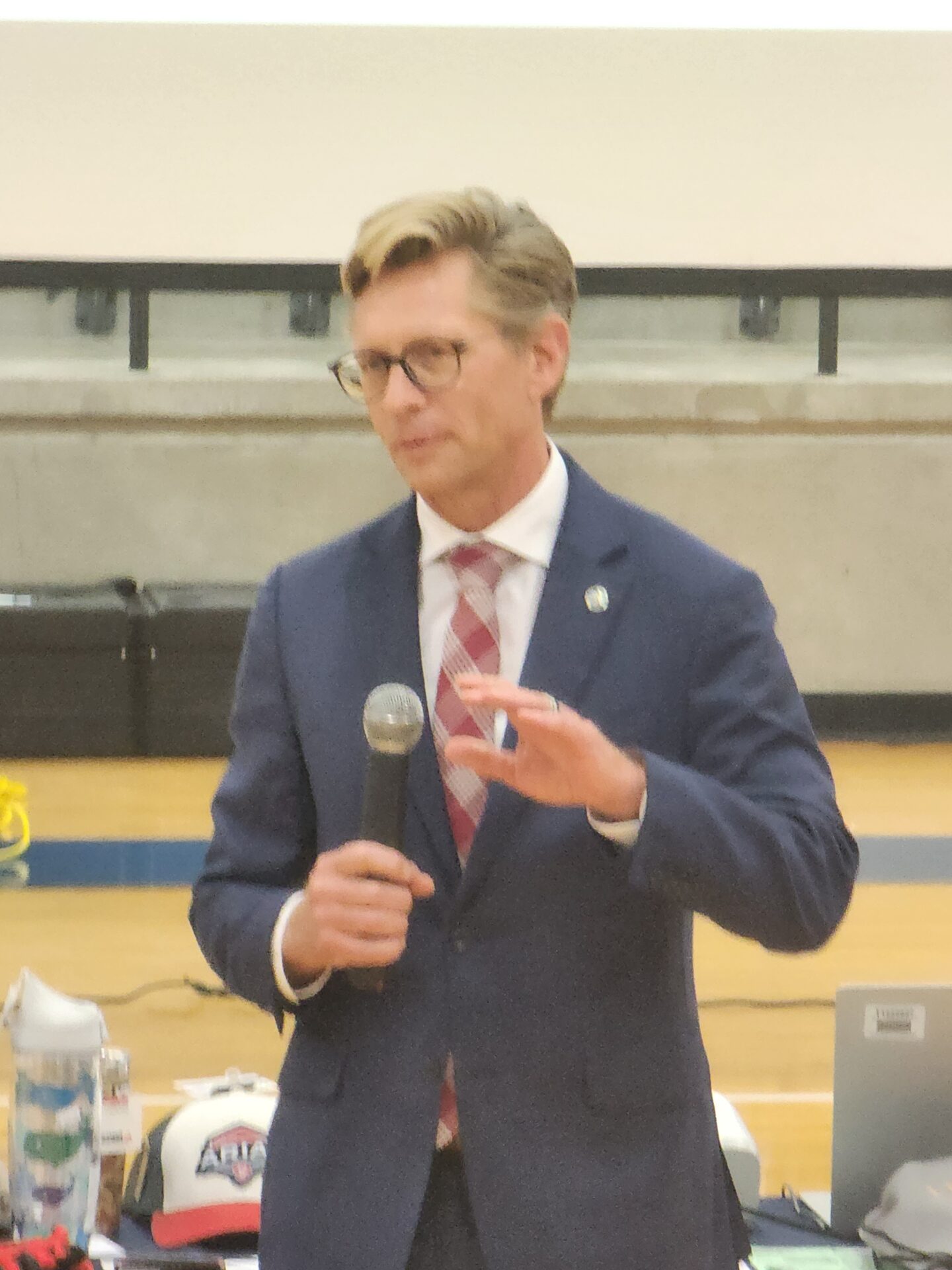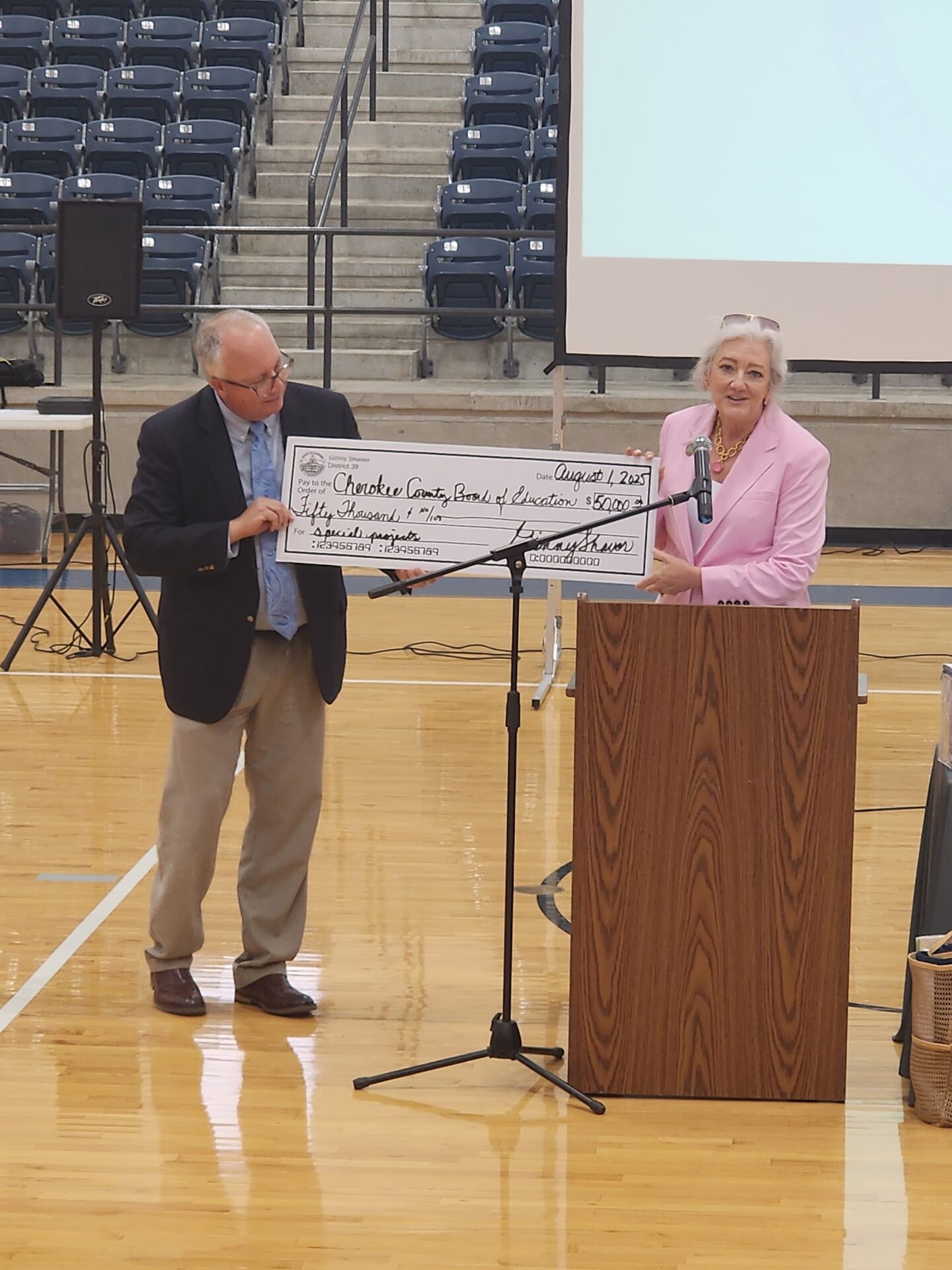 Senator Andrew Jones offered remarks and led an opening invocation, praying for a safe school year and for the protection of students and staff. He cited Proverbs 22:6 and James 1:5 in his message. State Representative Ginny Shaver led the Pledge of Allegiance and presented Superintendent Welsh with a $50,000 check for special projects benefiting the school system. She also referenced the recently passed Paid Parental Leave Act, which she helped support.