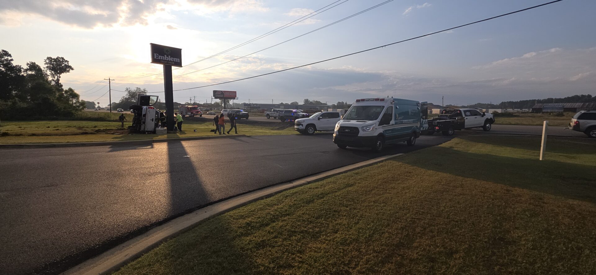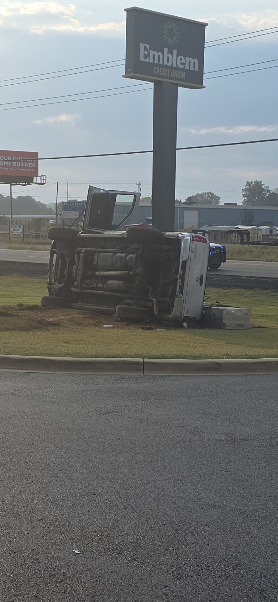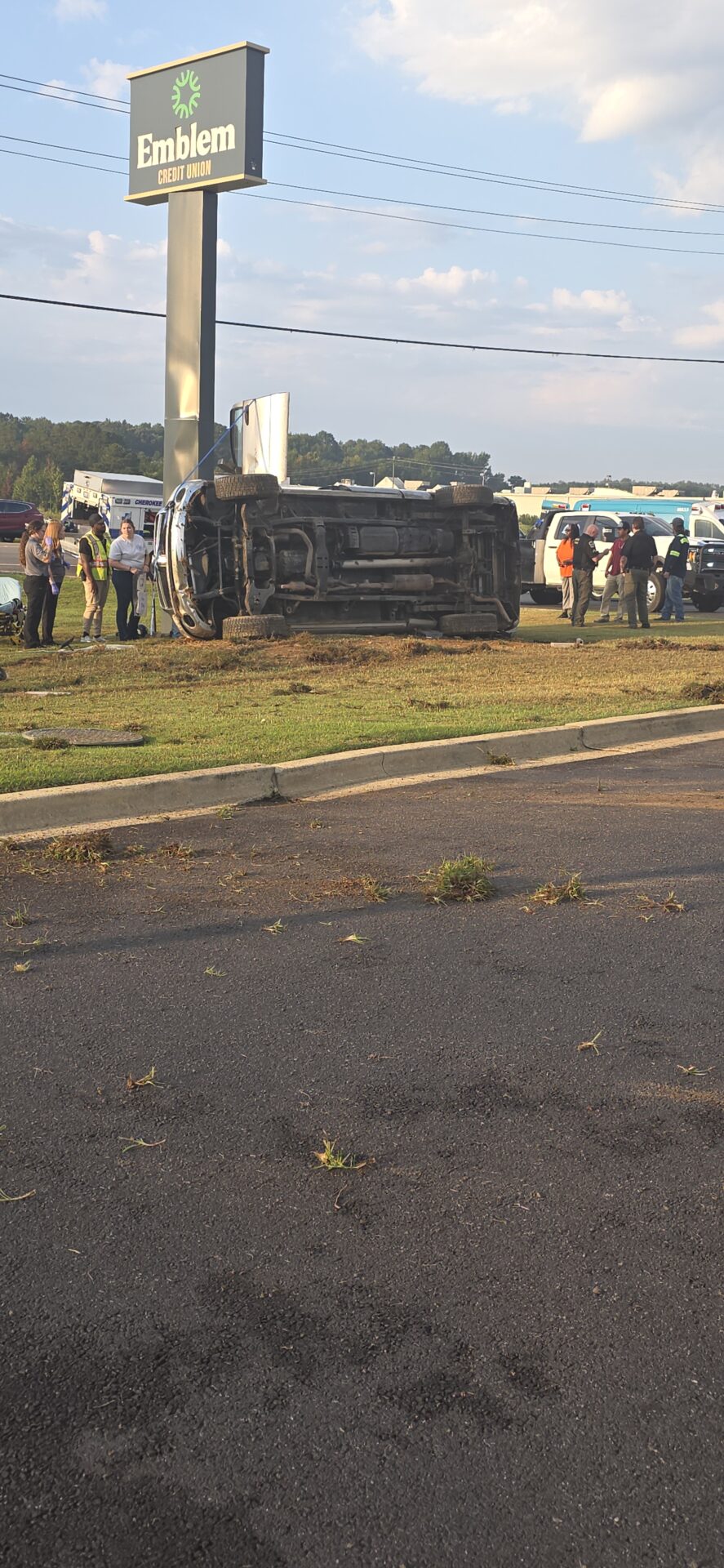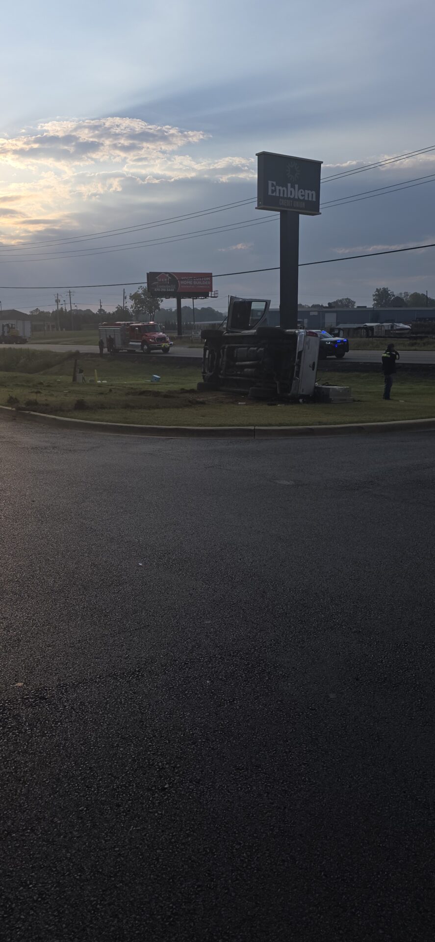 According to reports, a silver Dodge truck traveling toward Highway 411 left the roadway, lost control, and overturned down a steep embankment, coming to rest on its side at the base of the Emblem Bank sign. The driver was trapped inside and had to be extracted by emergency crews. He was conscious and able to communicate with first responders before being treated at the scene and transported by Atrium Floyd EMS to an area hospital for further evaluation.