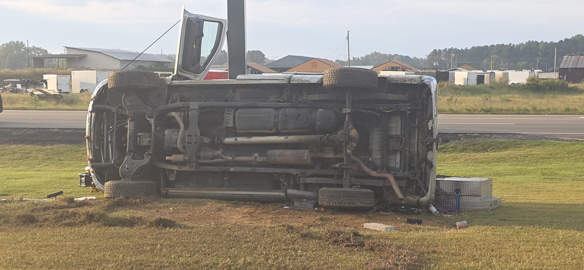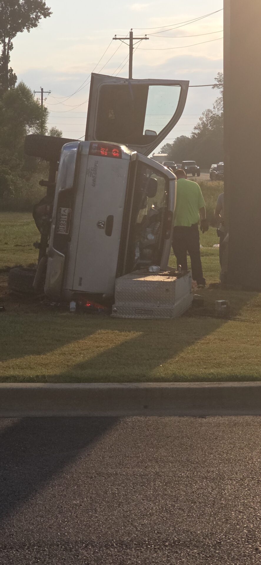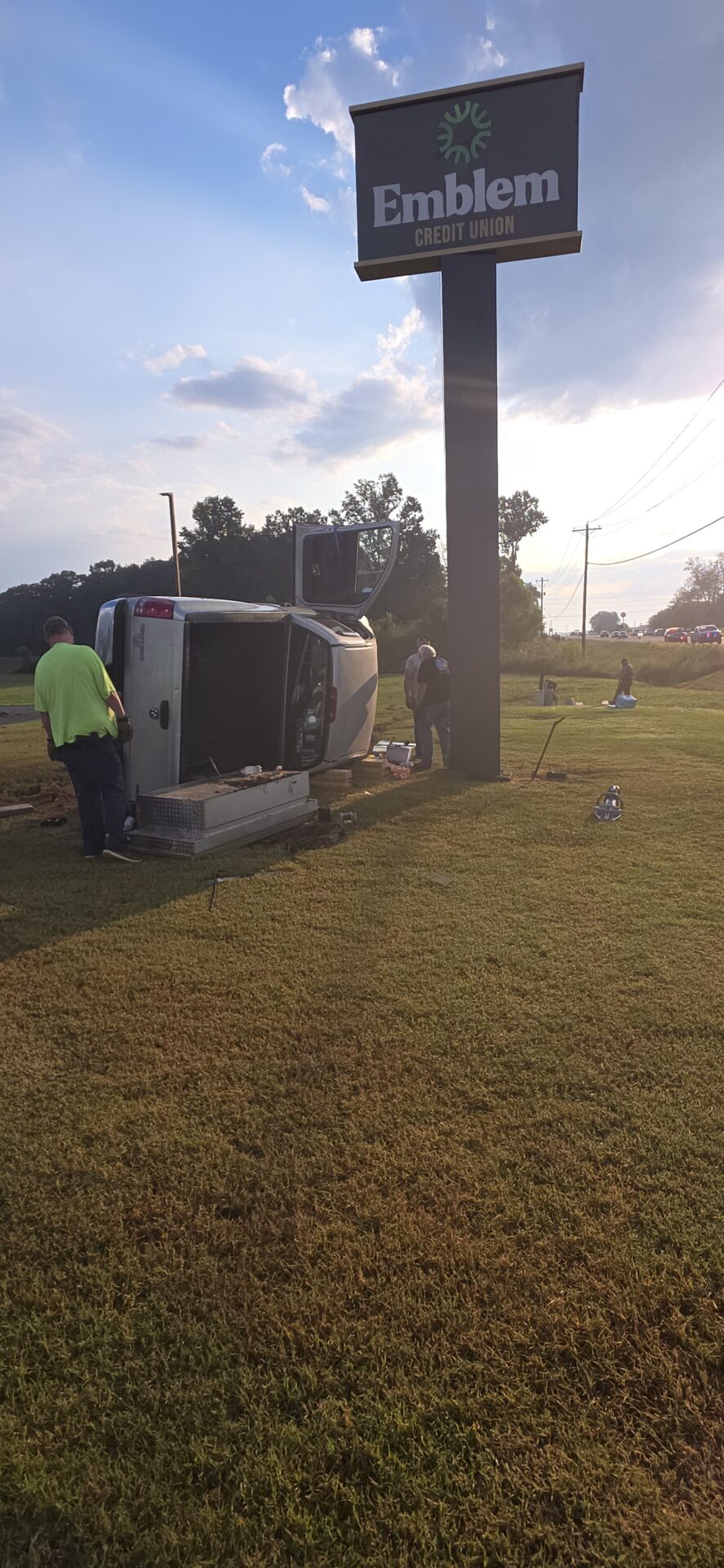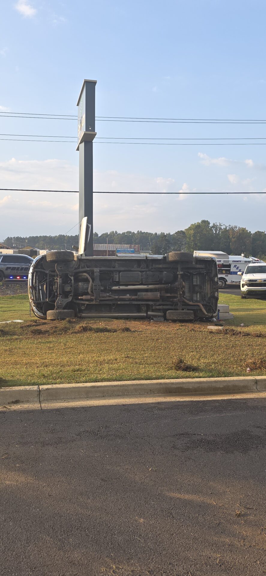 According to reports, a silver Dodge truck traveling toward Highway 411 left the roadway, lost control, and overturned down a steep embankment, coming to rest on its side at the base of the Emblem Bank sign. The driver was trapped inside and had to be extracted by emergency crews. He was conscious and able to communicate with first responders before being treated at the scene and transported by Atrium Floyd EMS to an area hospital for further evaluation.