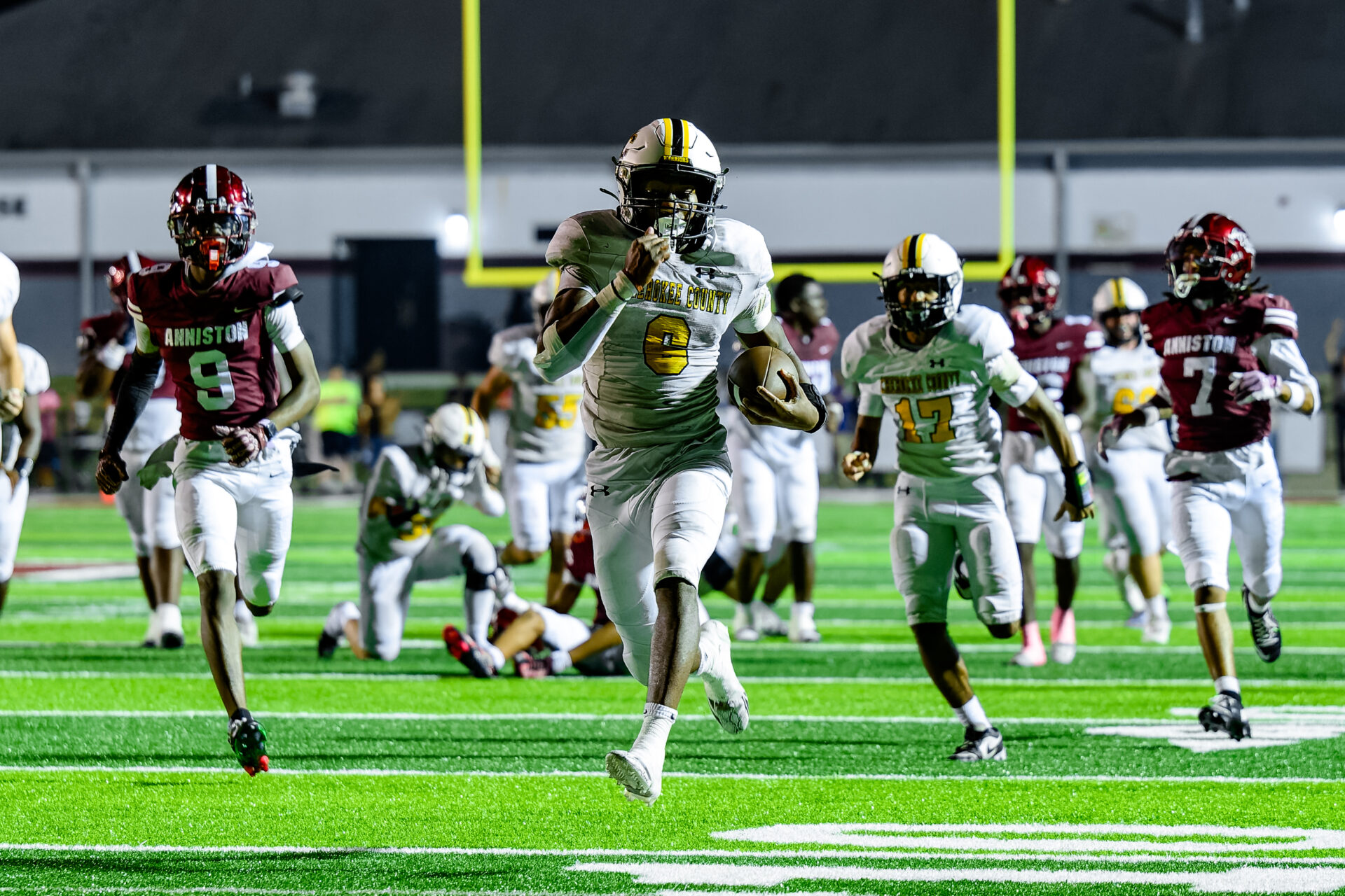 Keyshawn Woods breaks away on a 36-yard touchdown run in the second quarter at Anniston on Friday night. Photo courtesy of Brad Campbell/sport-shutter.com.