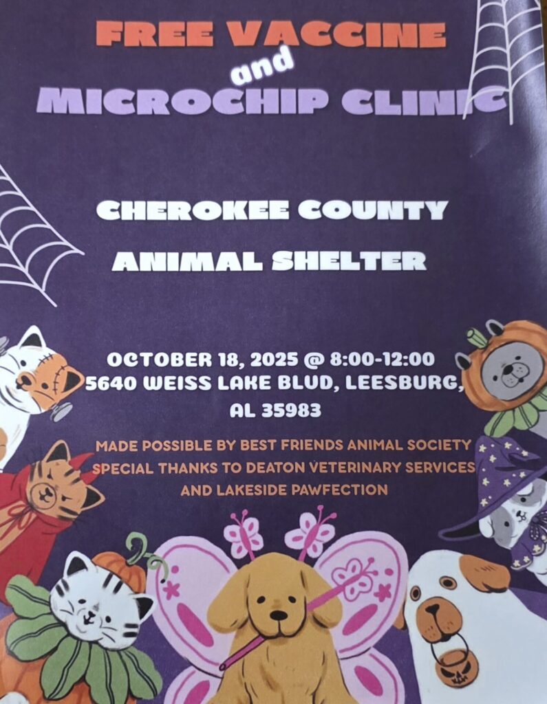 Centre- Pet owners in Cherokee County will have a great opportunity to protect their furry friends during a Free Vaccine and Microchip Clinic scheduled for Saturday, October 18, 2025, from 8 a.m. until noon at Lakeside Pawfection located at 5640 Weiss Lake Boulevard in Leesburg.