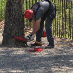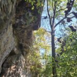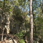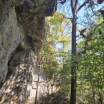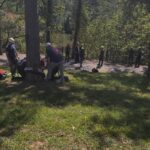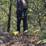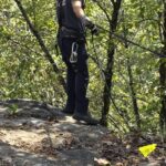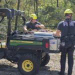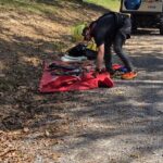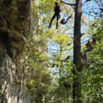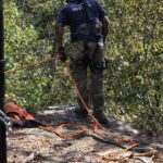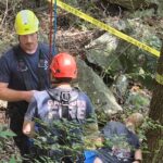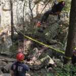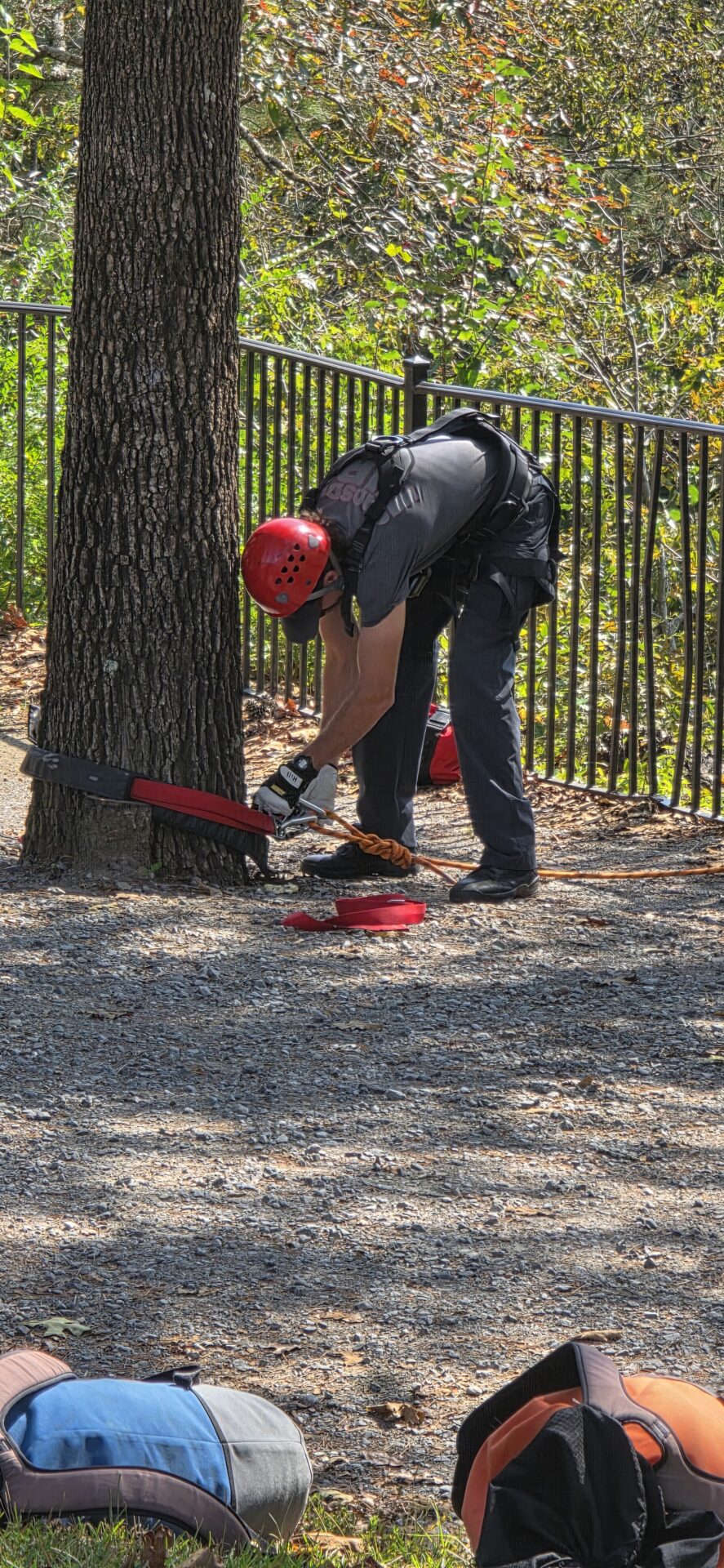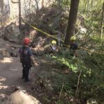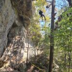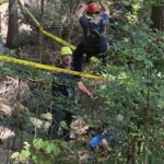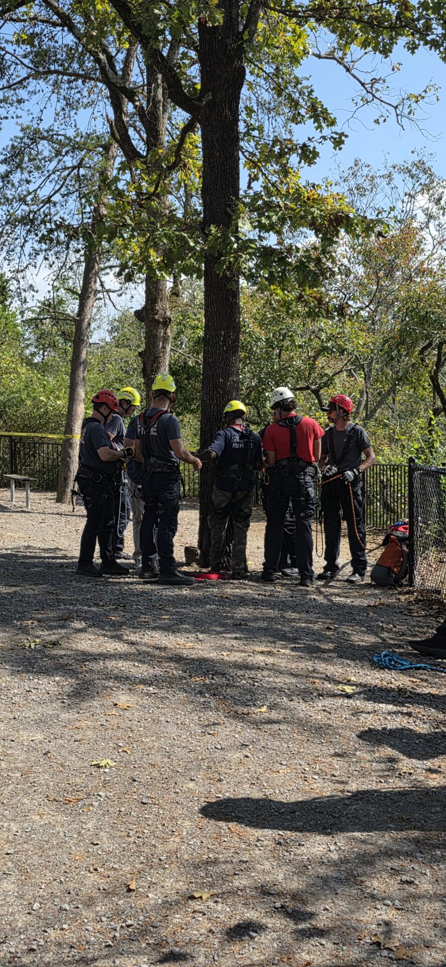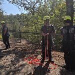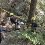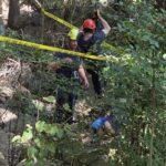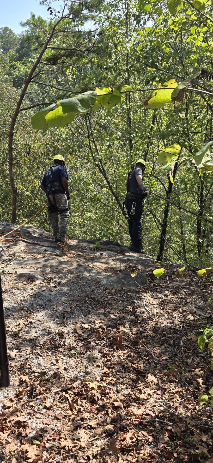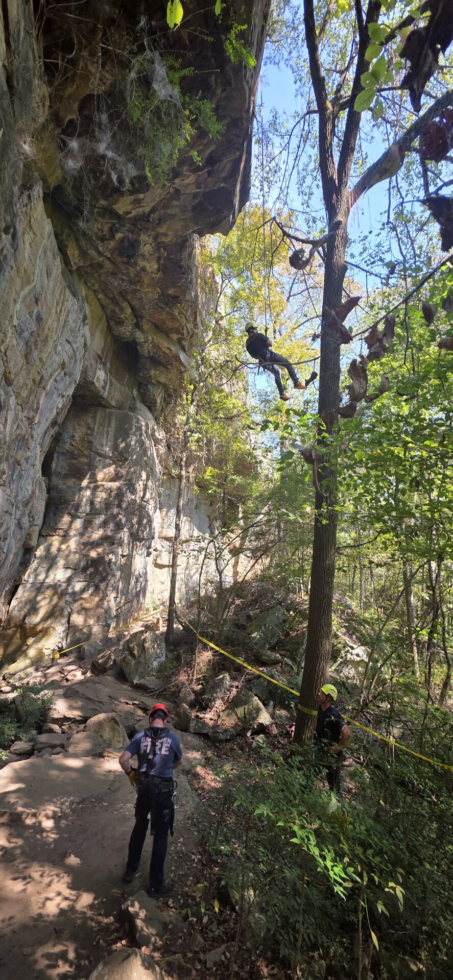 Following classroom sessions, firefighters took to the training tower to practice vertical movement and rope maneuvers before progressing to field exercises along the Noccalula Falls Gorge trail. In a simulated rescue, teams lowered rescuers from the cliff edge to the trail below, executing controlled descents and patient recovery operations in a wooded, steep terrain environment.