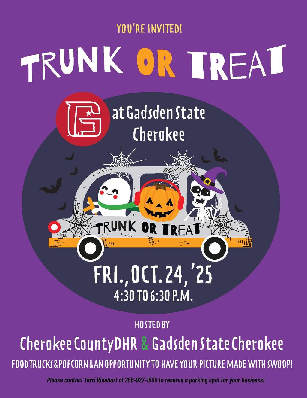 Gadsden State Cherokee and the Cherokee County Department of Human Resources will co-host Trunk or Treat on Friday, Oct. 24, from 4:30 p.m. to 6:30 p.m. in the front Academic Building parking lot at 801 Cedar Bluff Road in Centre, featuring games, candy, face painting, and photos with Gadsden State mascot “Swoop.”