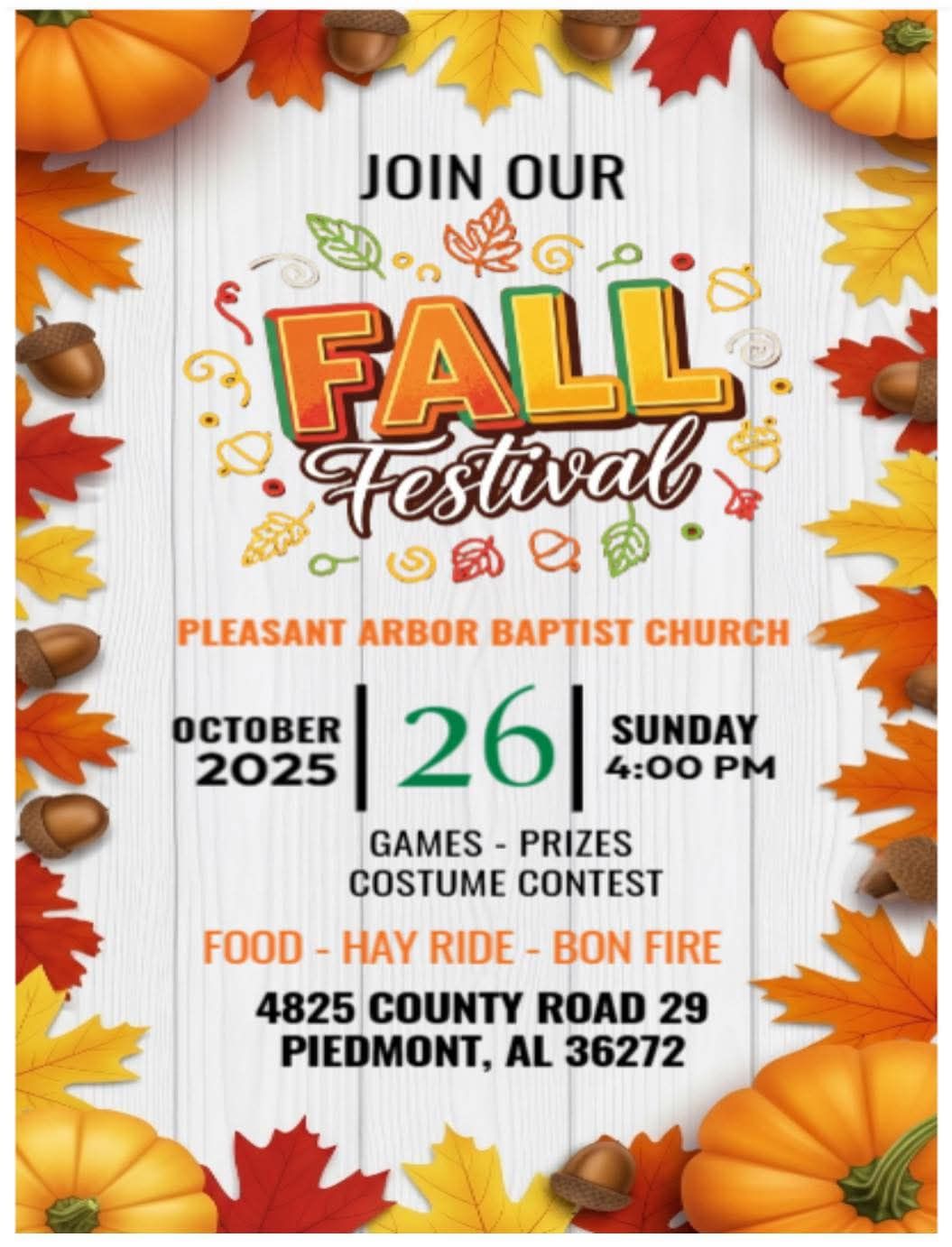 Join Pleasant Arbor Baptist Church for a Fall Festival on Sunday, October 26