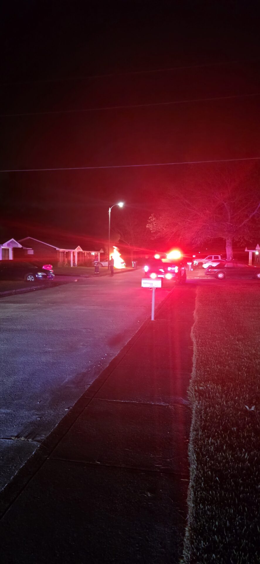 Several nearby residents, awakened by the noise and flashing lights, gathered outside—some wrapped in blankets—to watch as firefighters worked to bring the blaze under control.