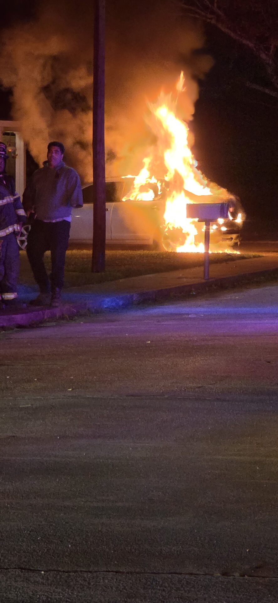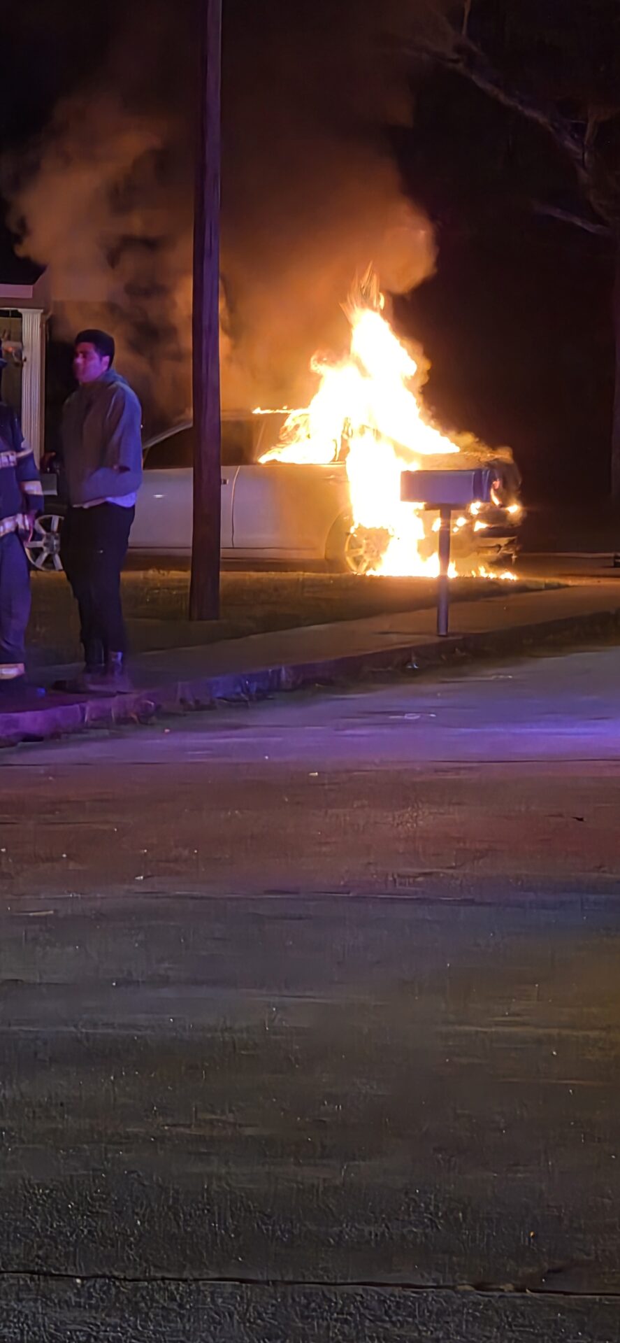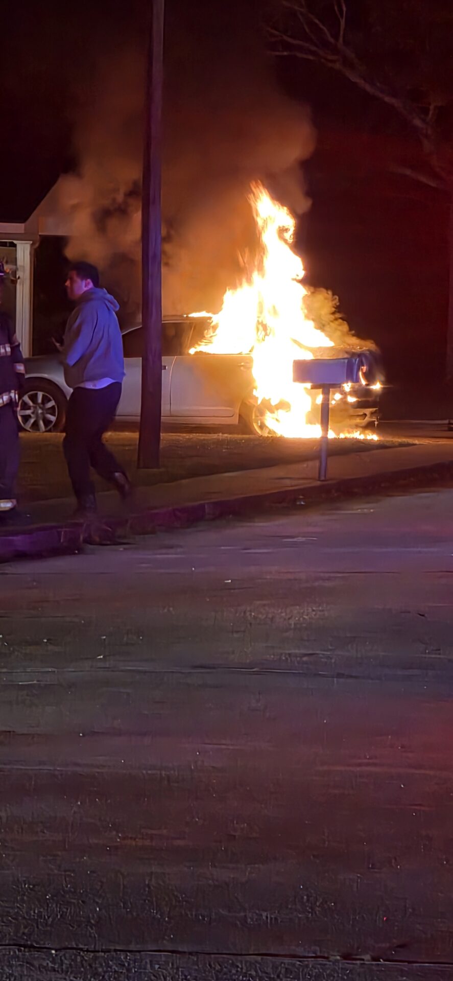 The blaze was reported just before 4:30 a.m. when flames were spotted coming from the rear of a vehicle parked near a residence. According to reports, the owner was able to move the car away from the structure before the fire spread, but the vehicle was soon fully engulfed in flames.