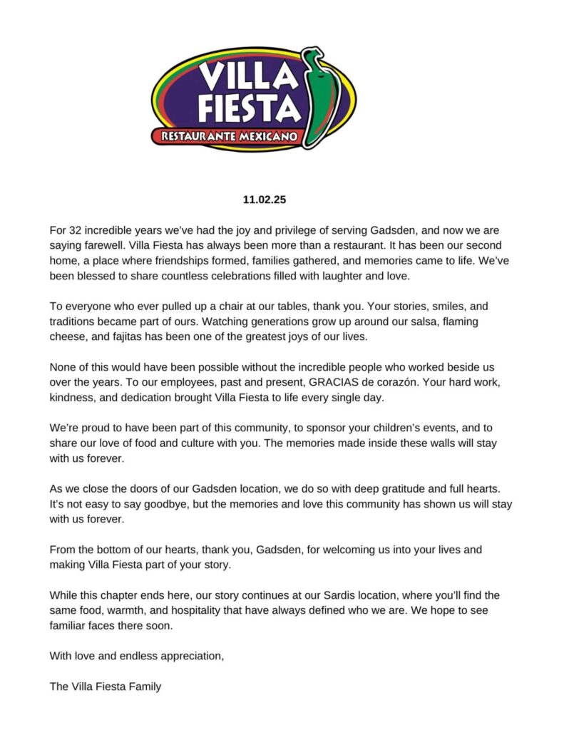 Gadsden-After more than three decades serving the Gadsden community, Villa Fiesta has announced it is closing its Gadsden location. The longtime Mexican restaurant shared the news in a statement dated November 2, 2025, marking the end of a 32-year chapter in the city.