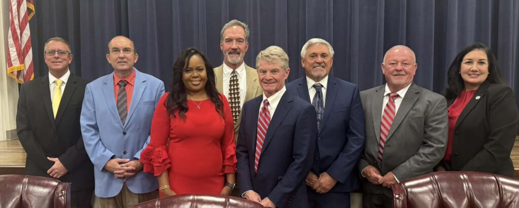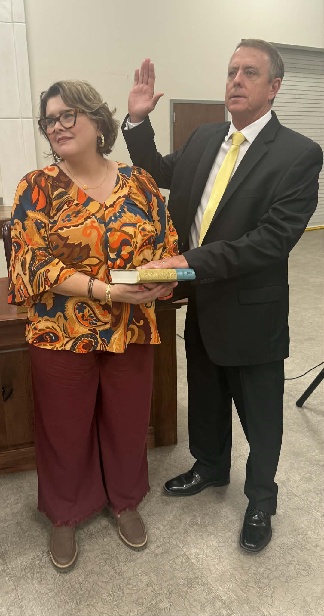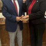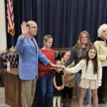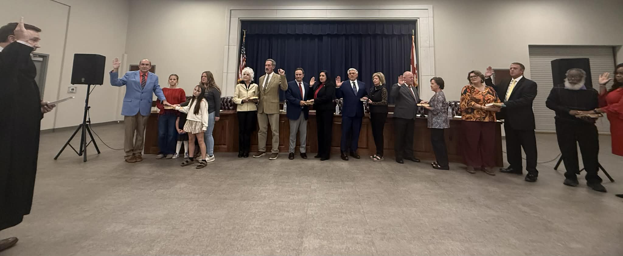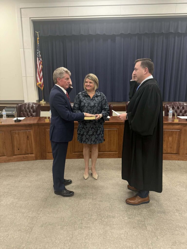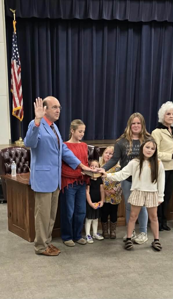 Judge Wesley Mobley presided over the ceremony in the absence of Judge Dean Buttram. Mayor Jay Howell took the Oath of Office with his wife, Tonya, holding the Bible. Judge Mobley then administered the oath to all seven council members together.