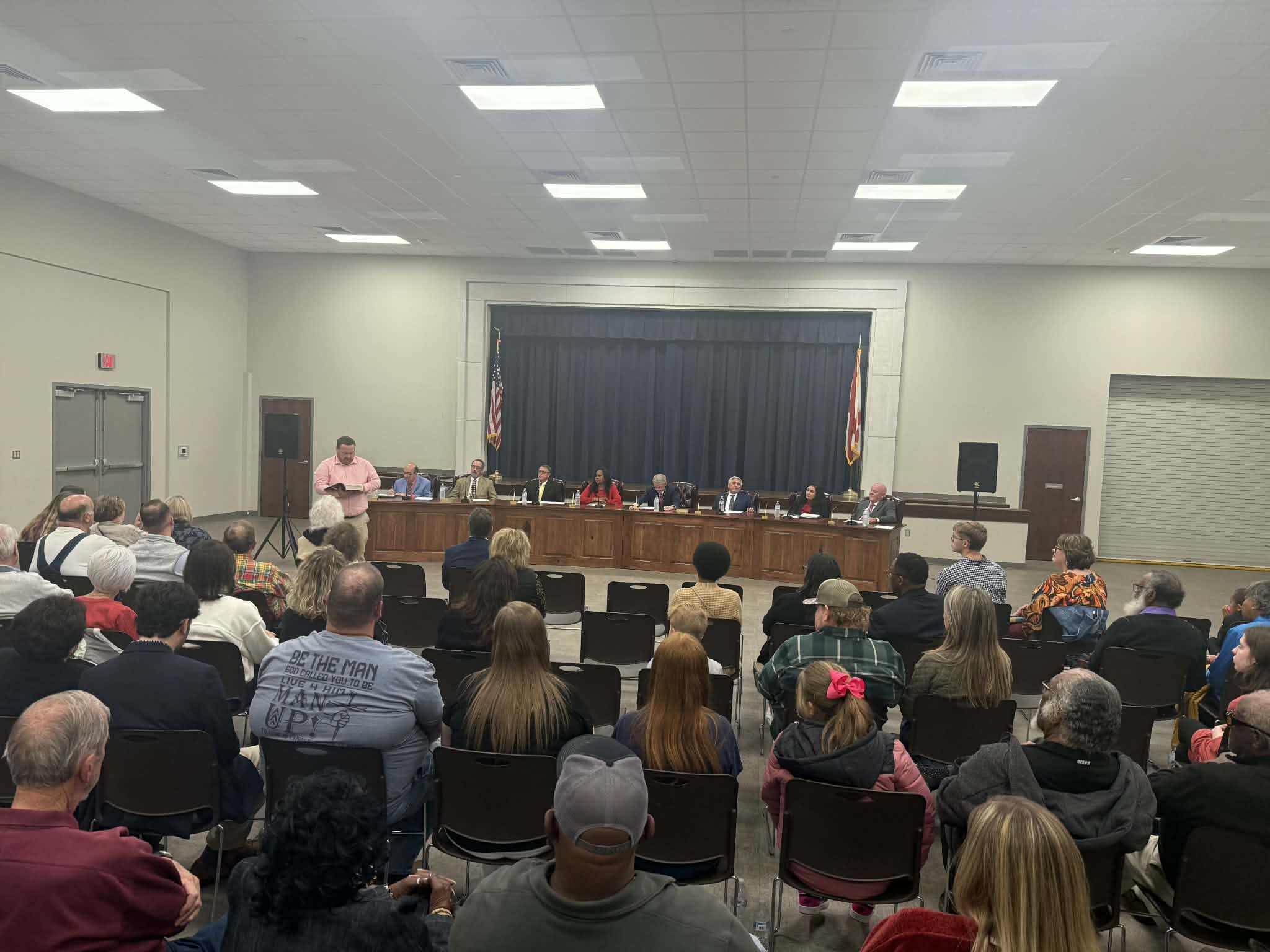The business session opened with a prayer led by Pastor Eddie Nation of First Baptist Church of Centre. Mayor Howell then asked the newly seated council whether they wished to continue with the current meeting schedule. Members unanimously agreed, and they also voted not to meet on Veterans Day, expressing appreciation for the service and sacrifice of all veterans.