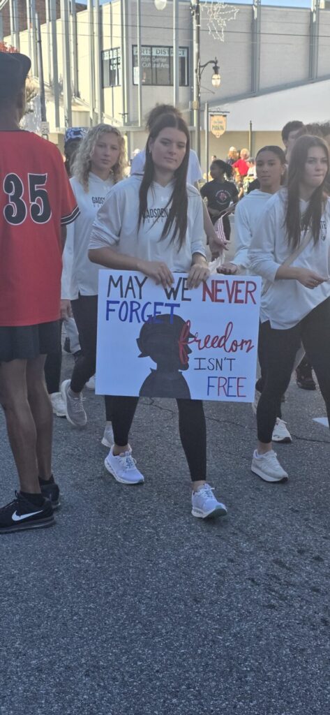 “It’s always wonderful to see Gadsden turn out to support our veterans,” Ford said. “As a member of the National Guard, I know how much it means for people to recognize the sacrifices made by those in our armed forces. The Patriots Association organized a wonderful program, and our Parks and Recreation Department put together another great parade. Thank you to everyone who participated and especially to those who served our country.”