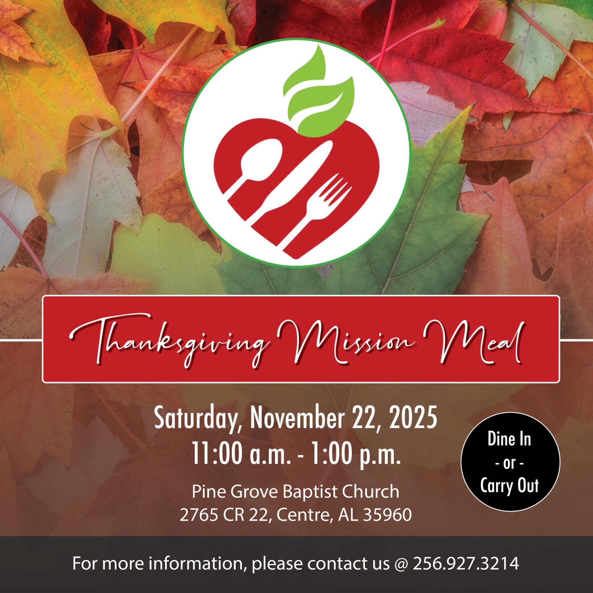 Pine Grove Baptist Church invites you to join them for their annual FREE Thanksgiving Meal on Saturday, Nov. 22, from 11 a.m. to 1 p.m. It will be dine-in or carry-out.