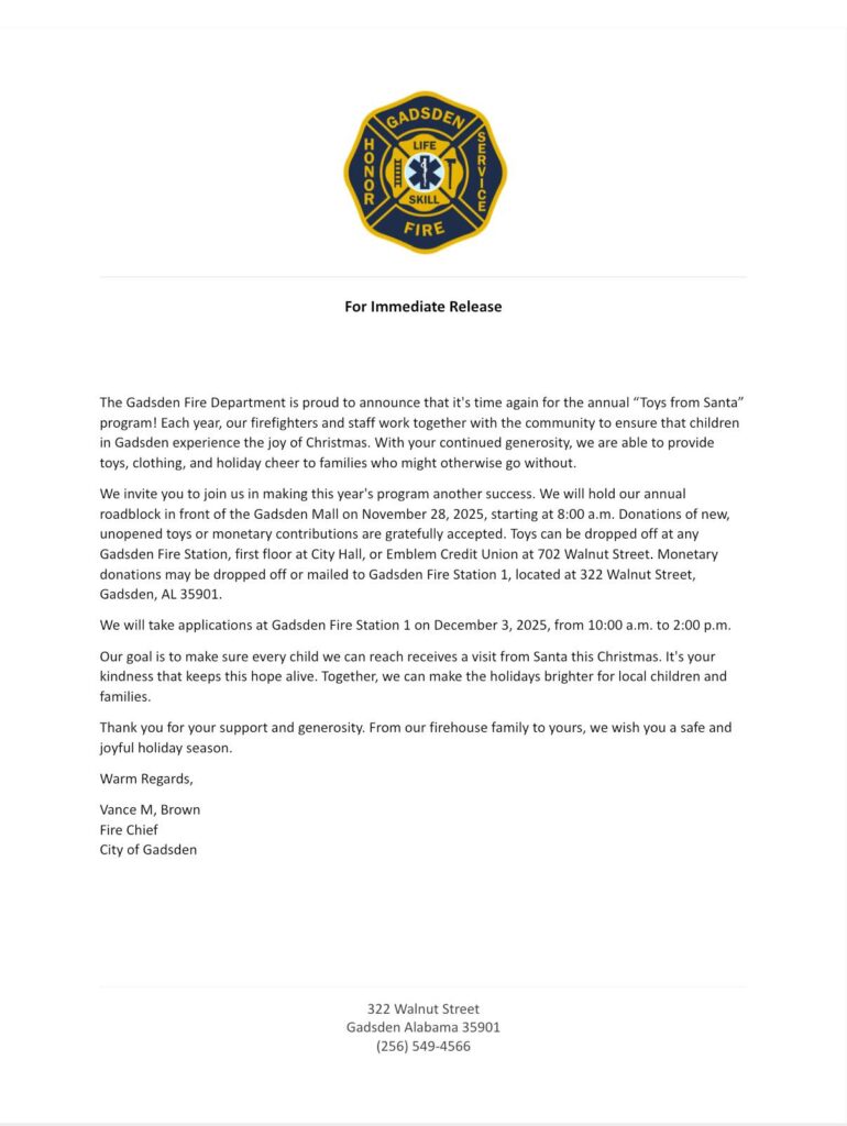 GADSDEN — The Gadsden Fire Department has released the collection schedule for its annual “Toys From Santa” toy drive, a long-standing program aimed at ensuring that children in need across the city experience the joy of Christmas.