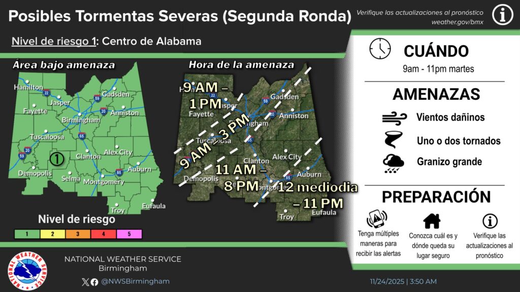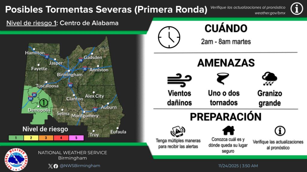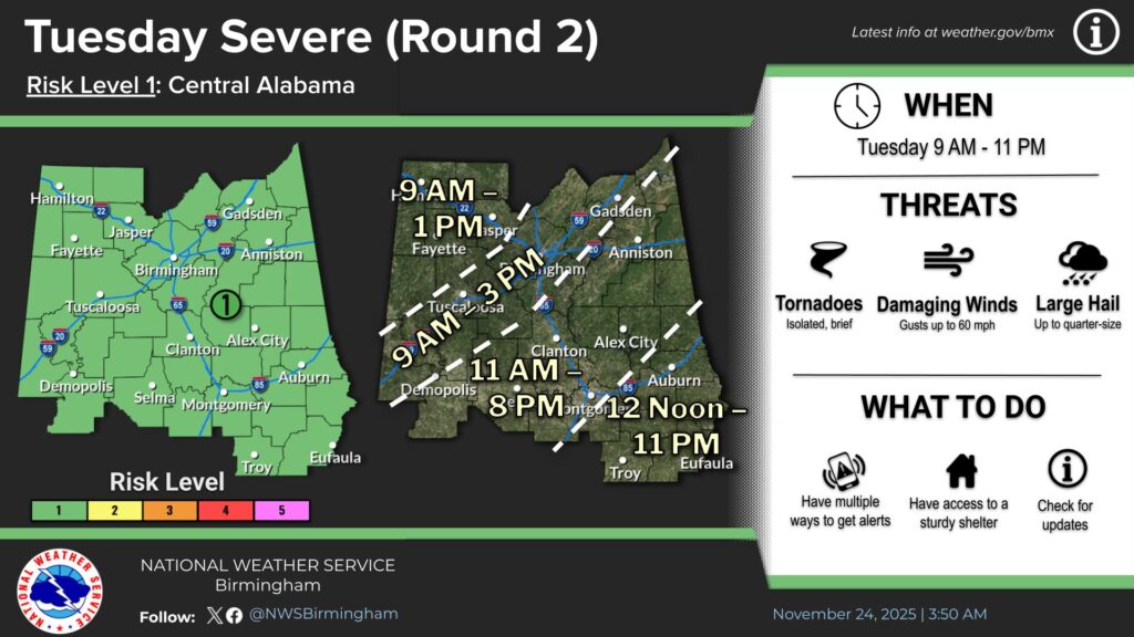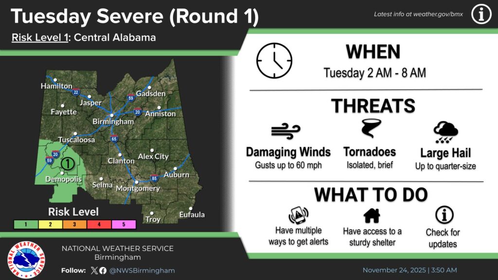 The National Weather Service in Birmingham is warning residents across Central Alabama to prepare for multiple rounds of potentially severe thunderstorms on Tuesday. The region is under a marginal risk for severe weather — a Level 1 out of 5 — with storms expected from the early morning hours through late Tuesday night.