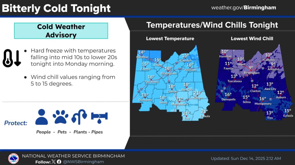COLD WEATHER ADVISORY REMAINS IN EFFECT FROM 6 PM THIS EVENING TO 7 AM CST MONDAY FOR ALL OF CENTRAL ALABAMA... * WHAT...Very cold wind chills as low as 5 degrees north to as low as 15 degrees south early Monday morning. * WHERE...All of Central Alabama. * WHEN...From 6 PM this evening to 7 AM CST Monday. * IMPACTS...Frostbite and hypothermia will occur if unprotected skin is exposed to these temperatures. An extended period of subfreezing temperatures could cause pipes to burst. PRECAUTIONARY/PREPAREDNESS ACTIONS... Use caution while traveling outside. Wear appropriate clothing, a hat, and gloves. Keep pets indoors as much as possible. Make frequent checks on older family, friends, and neighbors. Ensure portable heaters are used correctly. Do not use generators or grills inside. If you do not have heat in your home or lack shelter, you can call 211 or visit 211connectsalabama.org for assistance locating appropriate shelter from the cold. To prevent freezing and possible bursting of pipes they should be wrapped, drained, or allowed to drip slowly.![]()