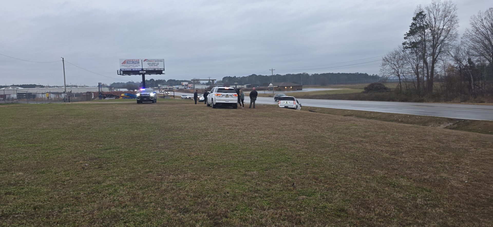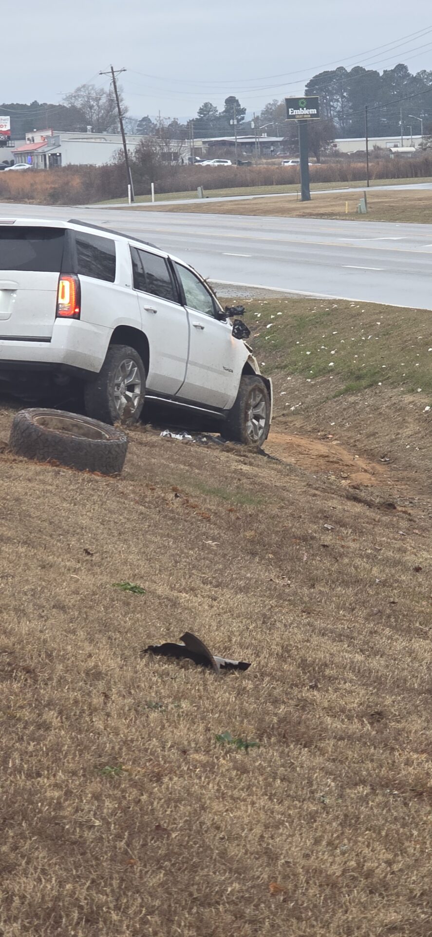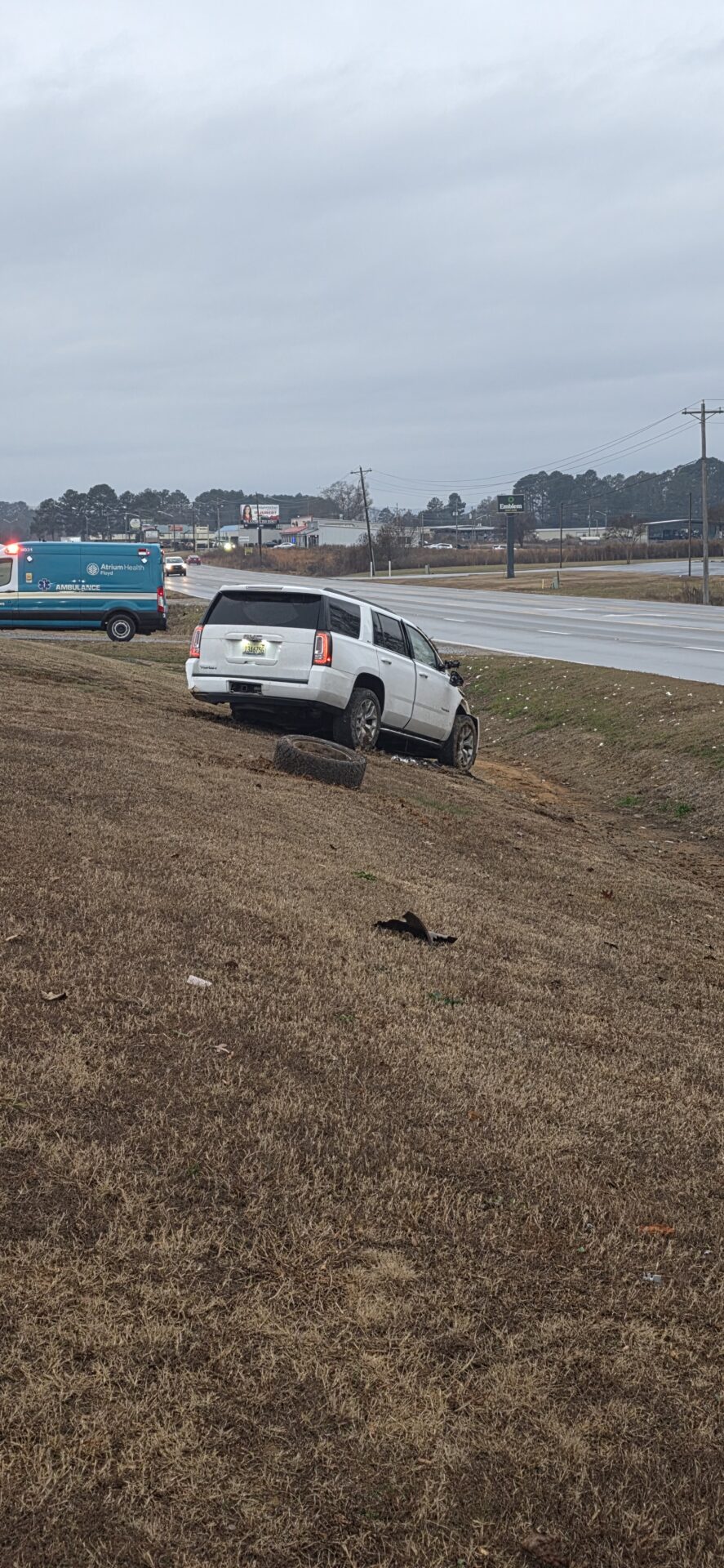 According to authorities, a white GMC Yukon traveled off the roadway and rolled before coming to rest in a field adjacent to the bank. Rain was falling at the time of the crash, which may have contributed to the incident.