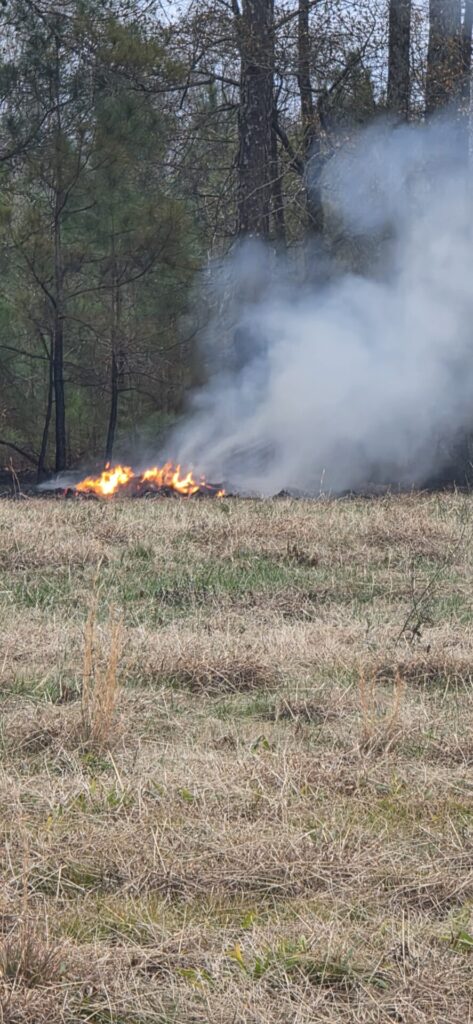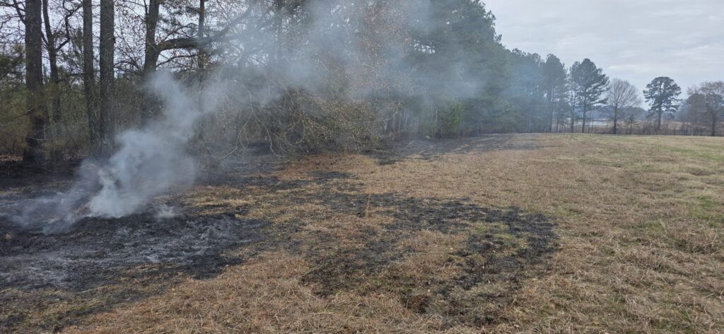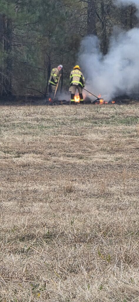 The fire burned into the edge of approximately 300 yards of wood line before crews stopped its forward progress. No injuries were reported, and no damage was reported beyond burned grass, fields, and wooded property.