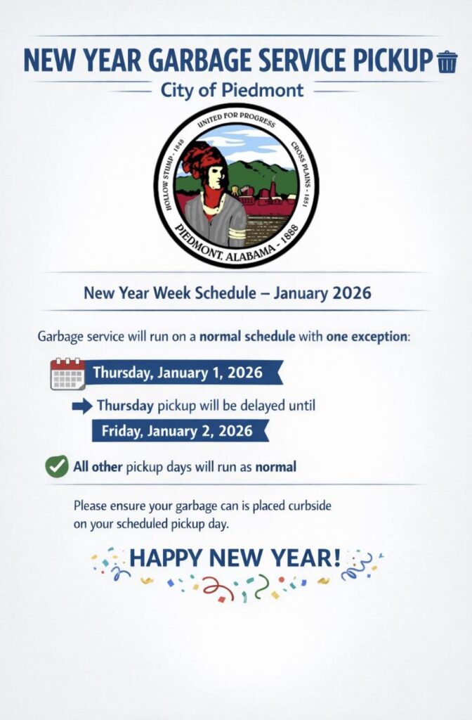 PIEDMONT, Ala.– The City of Piedmont is reminding residents about changes to garbage collection during the New Year week.