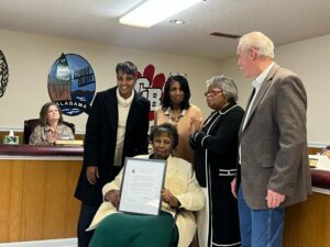 Another proclamation was approved honoring the life and service of Velma Sue Young, recognizing her decades of involvement with Cedar Bluff First Baptist Church and her role in founding the Cedar Bluff Alumni Association. The proclamation was presented to her son, David Young.
