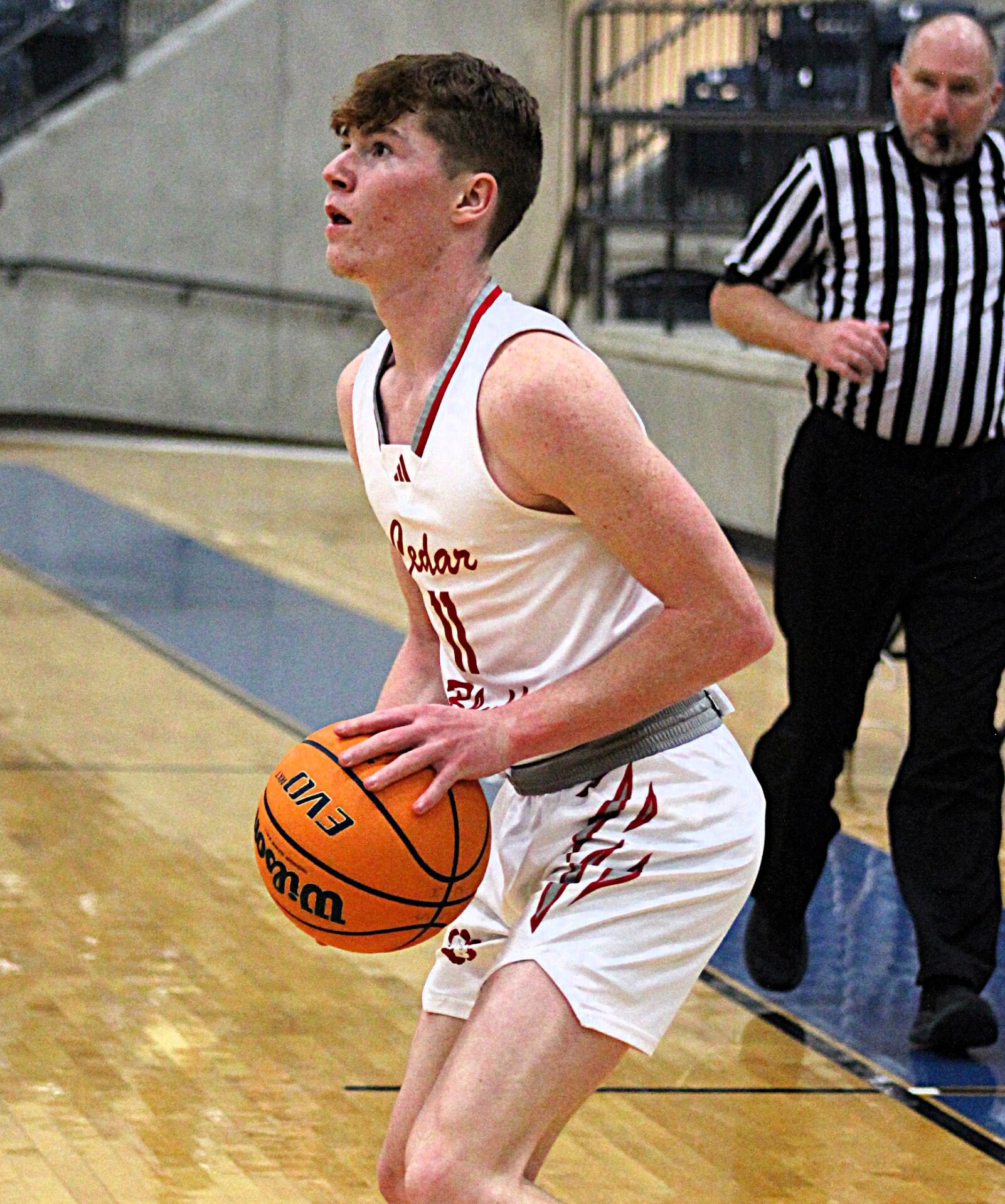 Cedar Bluff’s Zach Jones spots up for a 3-pointer against Spring Garden on Friday in the Cherokee County Tournament semifinals at Richard Lindsey Arena in Centre. Photo by Shannon Fagan.