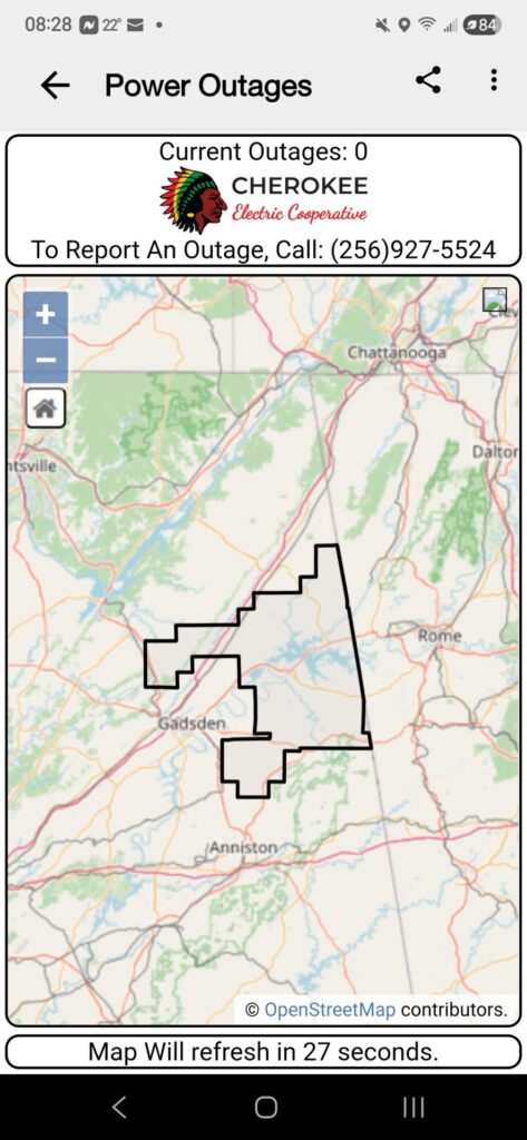 Officials said the new feature allows users to quickly access current outage information by opening the EMA app and selecting the “Power Outage” button. The button links directly to the Cherokee Electric Cooperative outage map, where residents can view reported power outages across the county.
