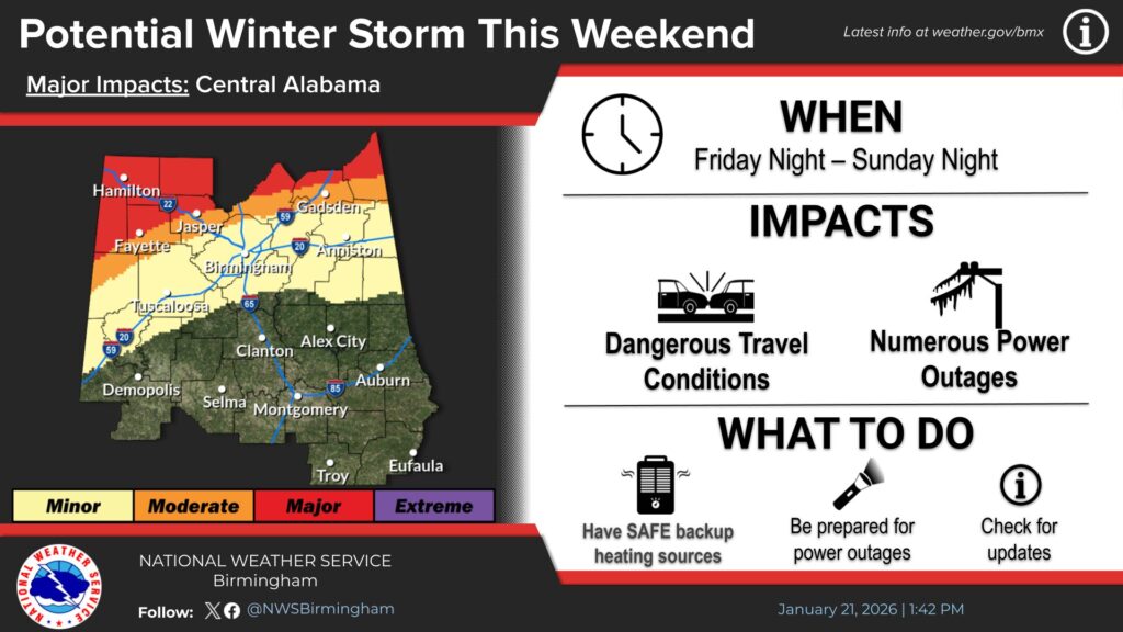 A Winter Storm Watch remains in effect from Friday evening through Sunday afternoon for much of north and central Alabama.