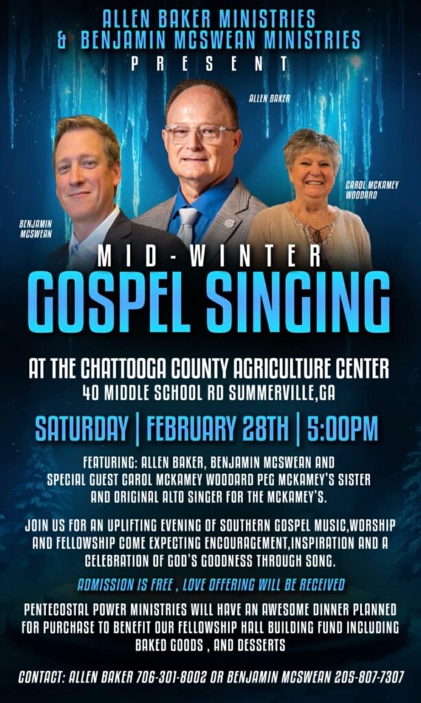 SUMMERVILLE, Ga. — A special evening of Southern gospel music and worship is planned for Saturday, February 28, as Allen Baker Ministries and Benjamin McSwan Ministries present a Mid-Winter Gospel Singing at the Chattooga County Agriculture Center.