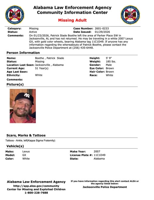 Anyone with information regarding the whereabouts of Patrick Slade Boothe is urged to contact the Jacksonville Police Department at (256) 435-6448. Tips may also be submitted through CrimeStoppers at 215-STOP or by calling 1-833-AL1-STOP. Information can also be provided online at www.215stop.com.