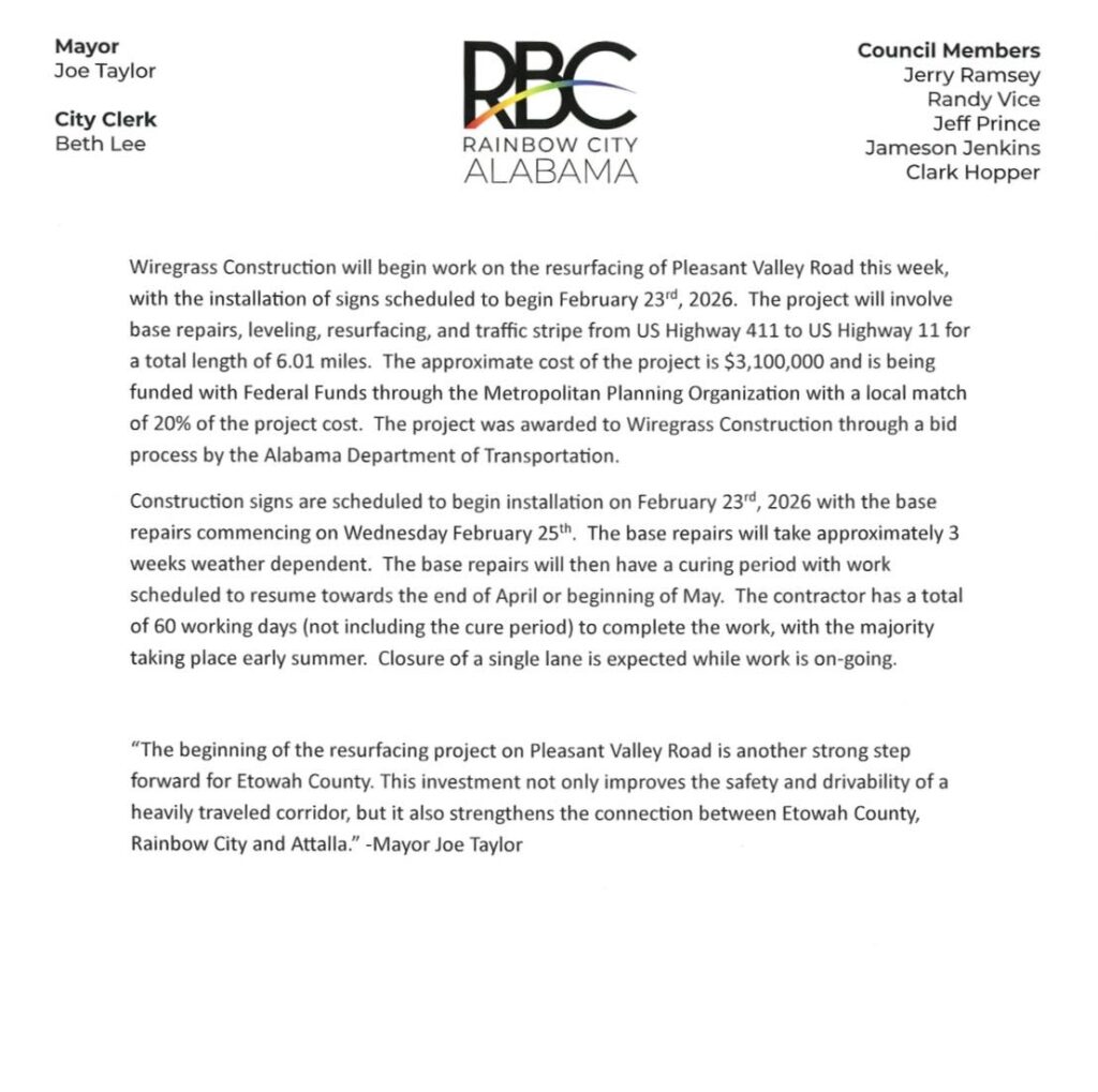 Rainbow City — A major resurfacing project on Pleasant Valley Road is set to begin this week, bringing significant roadway improvements to a key corridor through the city.