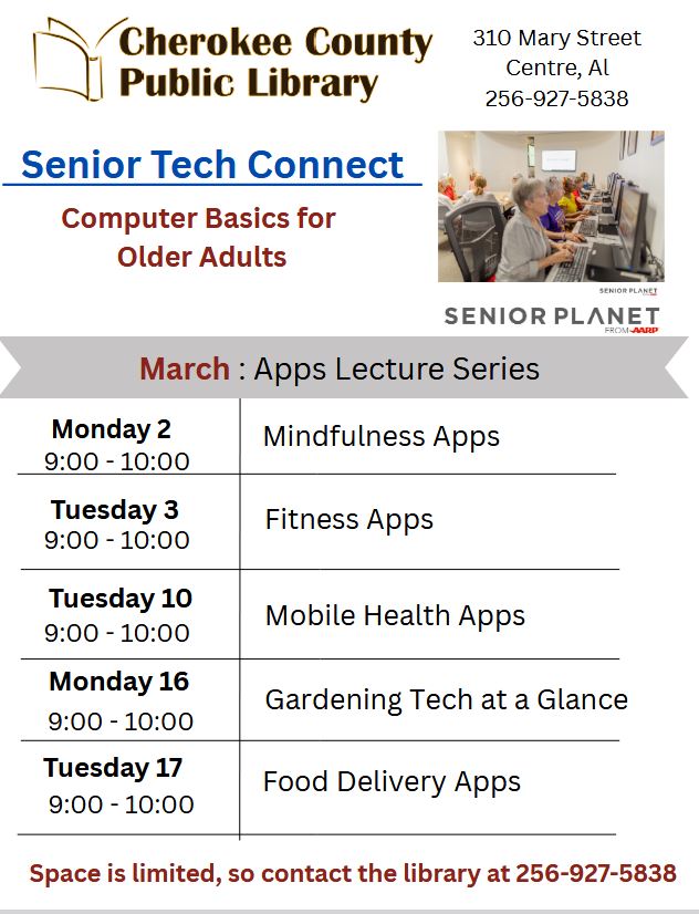 The Cherokee County Public Library will host Senior Tech Connect, a series of computer and technology classes designed for older adults.