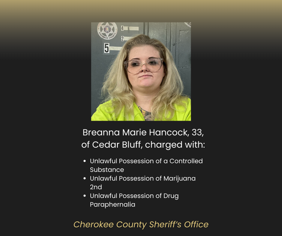 Breanna Marie Hancock, 33, of Cedar Bluff was charged with Unlawful Possession of a Controlled Substance, Unlawful Possession of Marijuana, 2nd Degree and Unlawful Possession of Drug Paraphernalia.