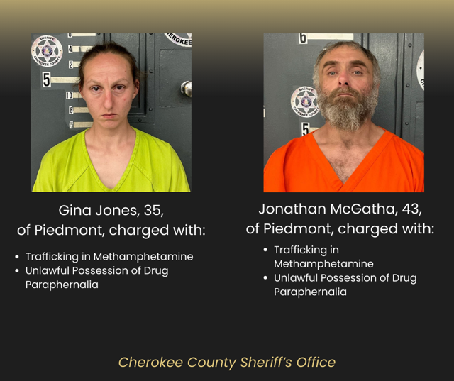 Gina Heather Jones, 35, of Piedmont arrested on charges of Trafficking in Methamphetamine and Unlawful Possession of Drug Paraphernalia.