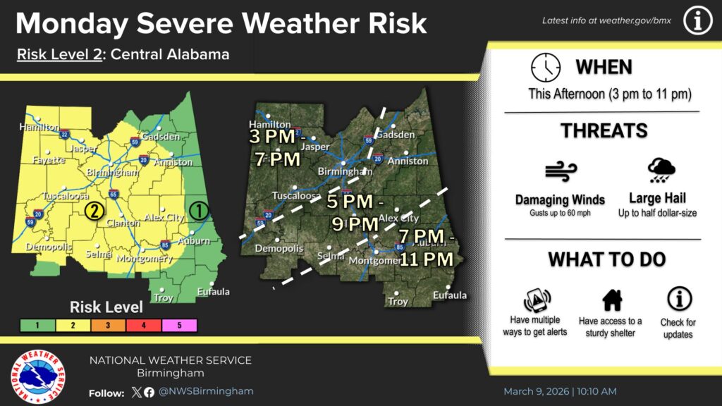 There is a level 1 to 2 out of 5 risk for severe storms for all of Central Alabama for this afternoon & evening from 3 pm to 11 pm. Threats include damaging wind gusts up to 60 mph & large hail up to half dollar size.